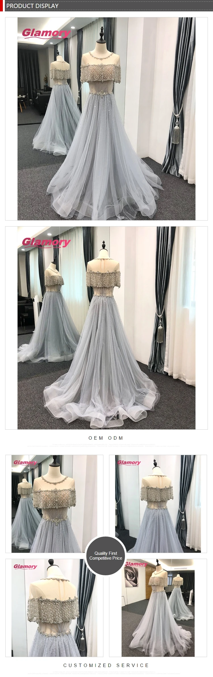 Hot Sale Evening Dresses Light Blue Short Sleeve a Line Party Wear Crystal Beaded Tulle Sexy Prom Dress