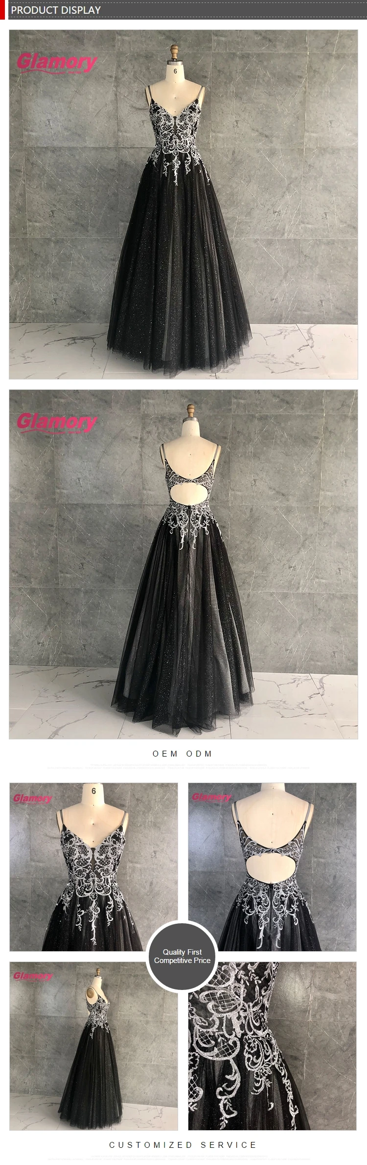 Chaozhou Factory 2020 New Design Lace Applique Spaghetti Strap A-line Black Glitter Tulle Maxi Prom Dress for Banquet