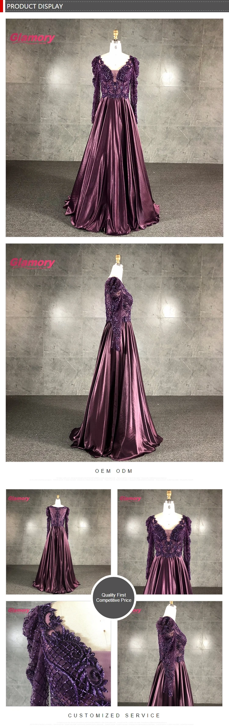 Purple Sleeve Sexy Gown Hand-Beading Satin a Line Evening Dress Elegant Formal Long Dresses for Fat Women