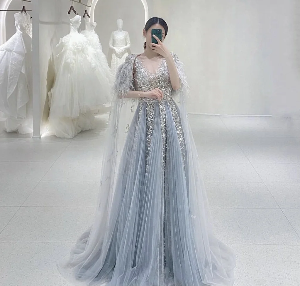A-Line Evening Dresses With Feathers Shawl Women Shiny Beaded Prom Dress Robe De Soiree