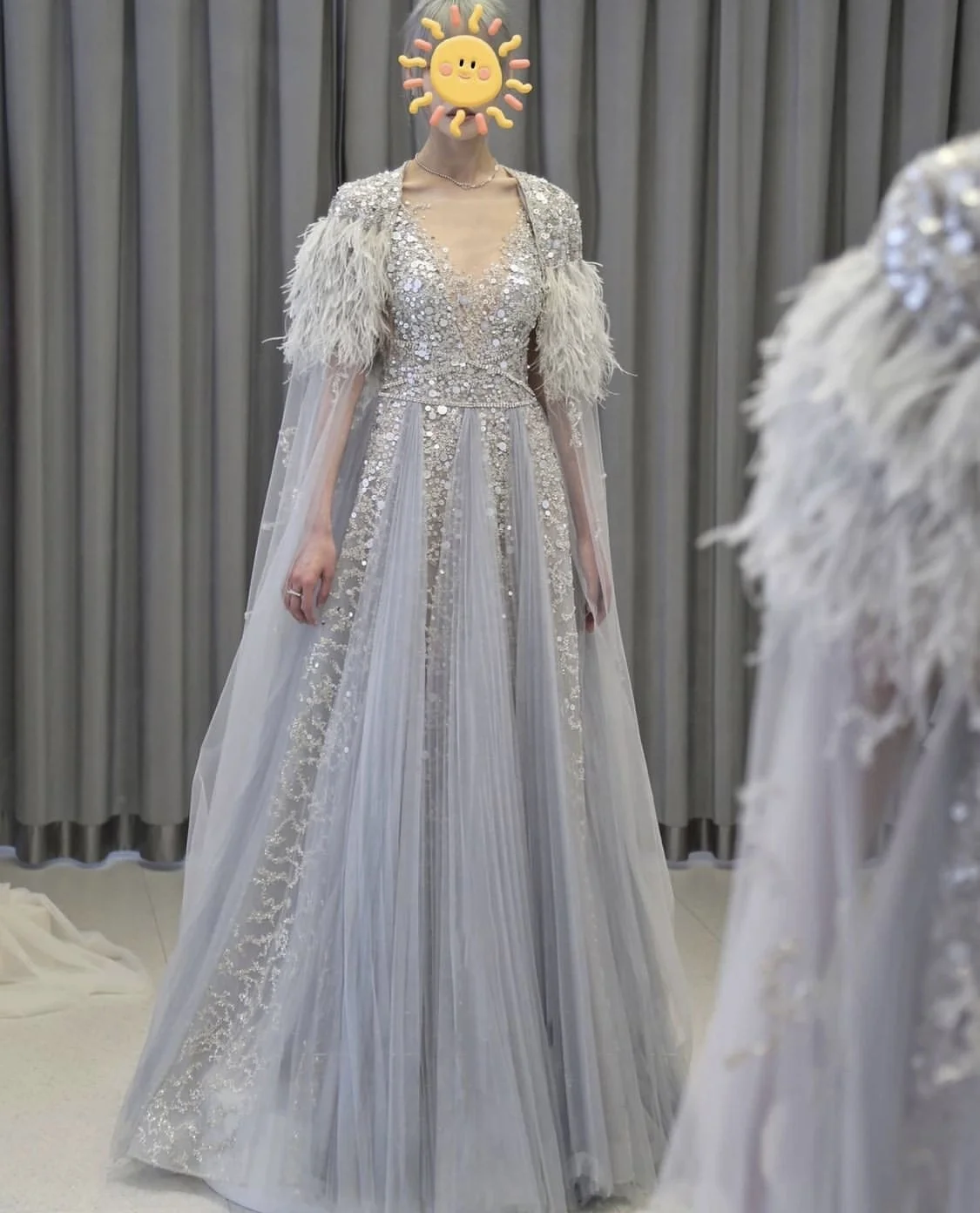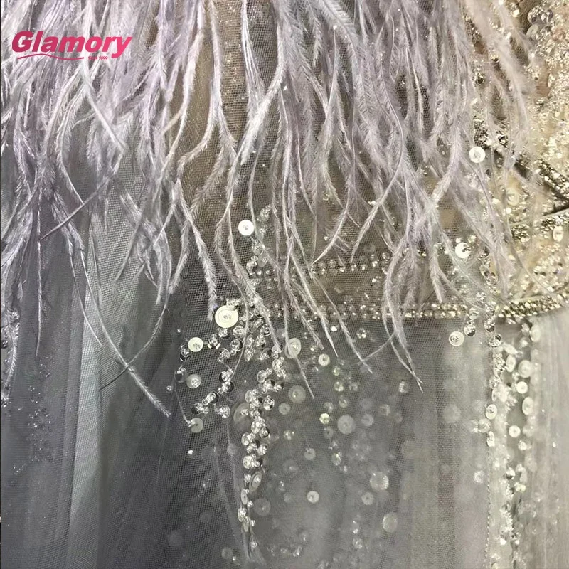 A-Line Evening Dresses With Feathers Shawl  Women Shiny Beaded Prom Dress Robe De Soiree