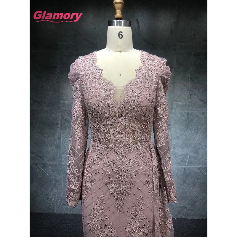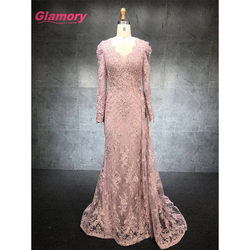 2021 New Arrival Long Sleeve Full Lace Evening Dresses Pink V-neck Embroidery Lace Evening Gown