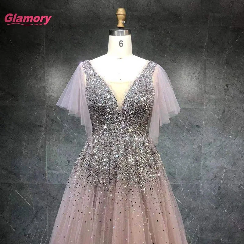 2021 New Design Pink Short Sleeve a Line Beads Evening Sparkle Prom Dress Gowns