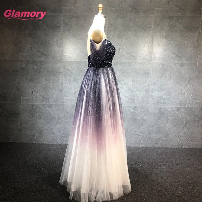 New Arrival Off-Shoulder Party Prom Crystal Beaded Gradual Change Color Shining Tulle Evening Gowns