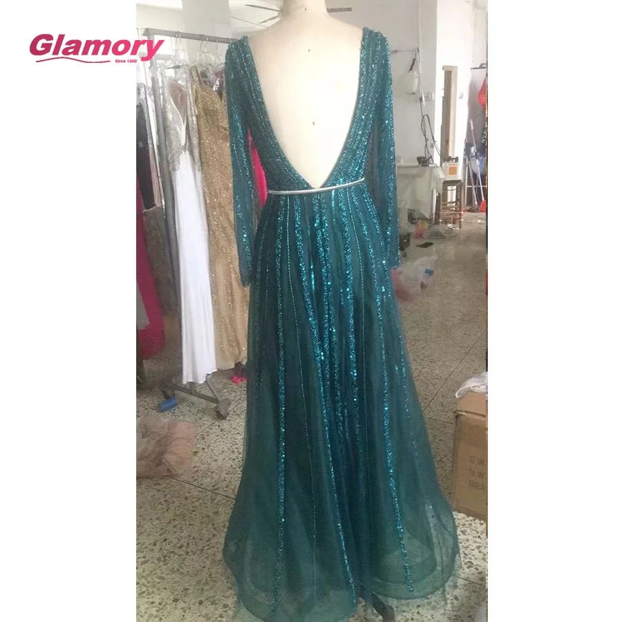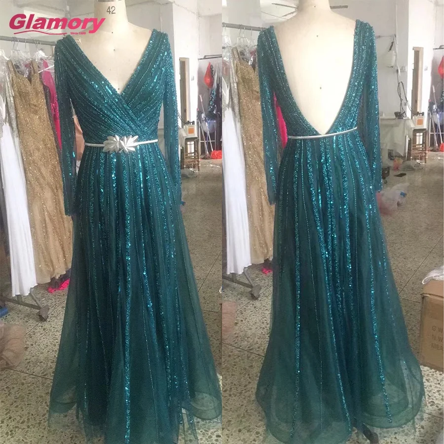 2021 Muslim Luxury Beaded Green V Neck a Line Full Sleeves Evening Party Long Gowns for Women