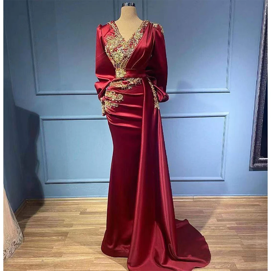 Modest Long Sleeve Handmade Beaded Ruffle Satin Party Elegant Mermaid Party Evening Dress for Woman