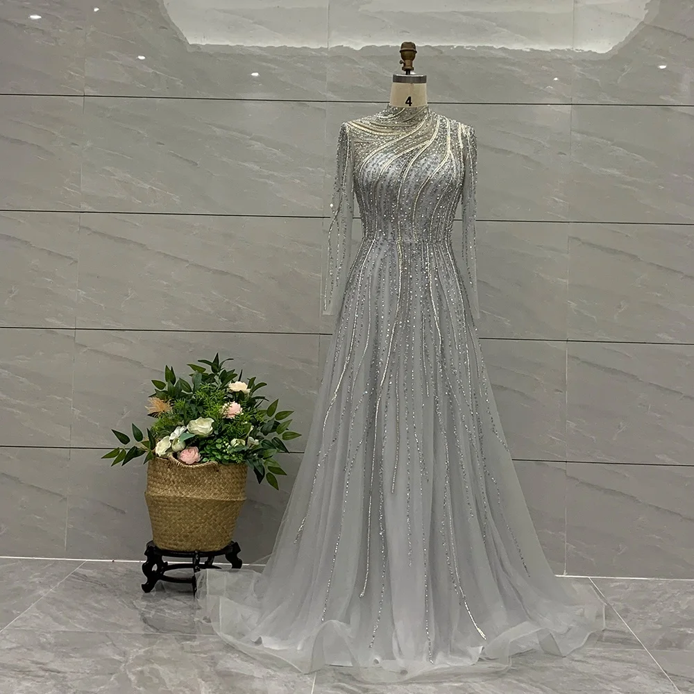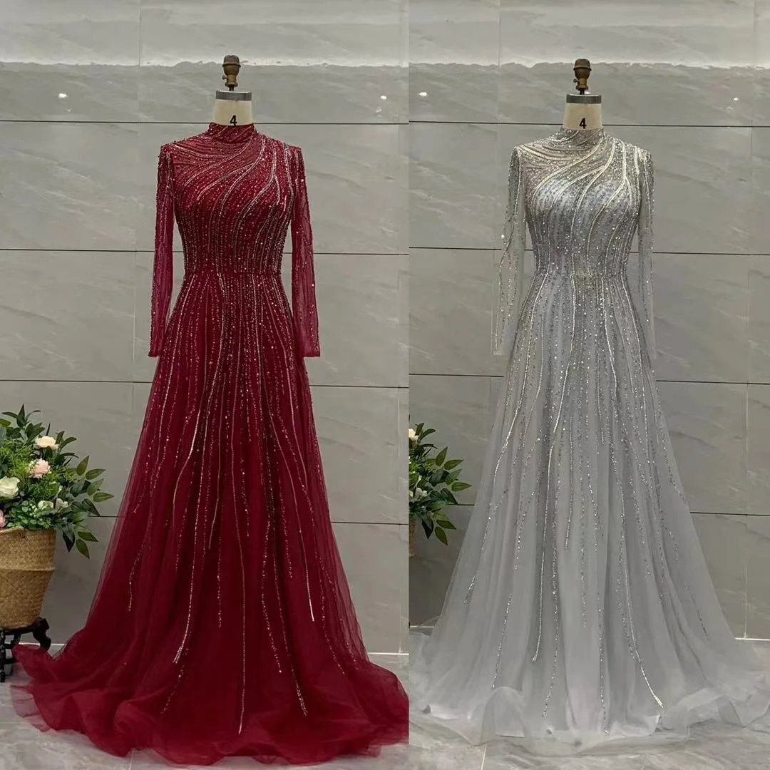 2020 New Arrival Long Sleeve Evening Dresses High Neckline Beaded Fancy Party Evening Gown for Women