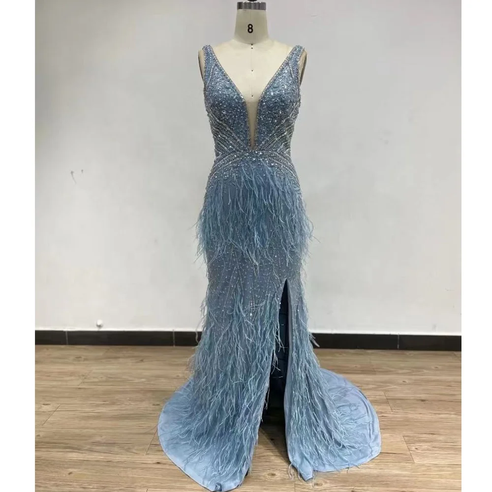 2022 New Handmade Beading Mermaid Evening Dresses With Feathers Sexy Split  Long  Evening Gowns for Women Party