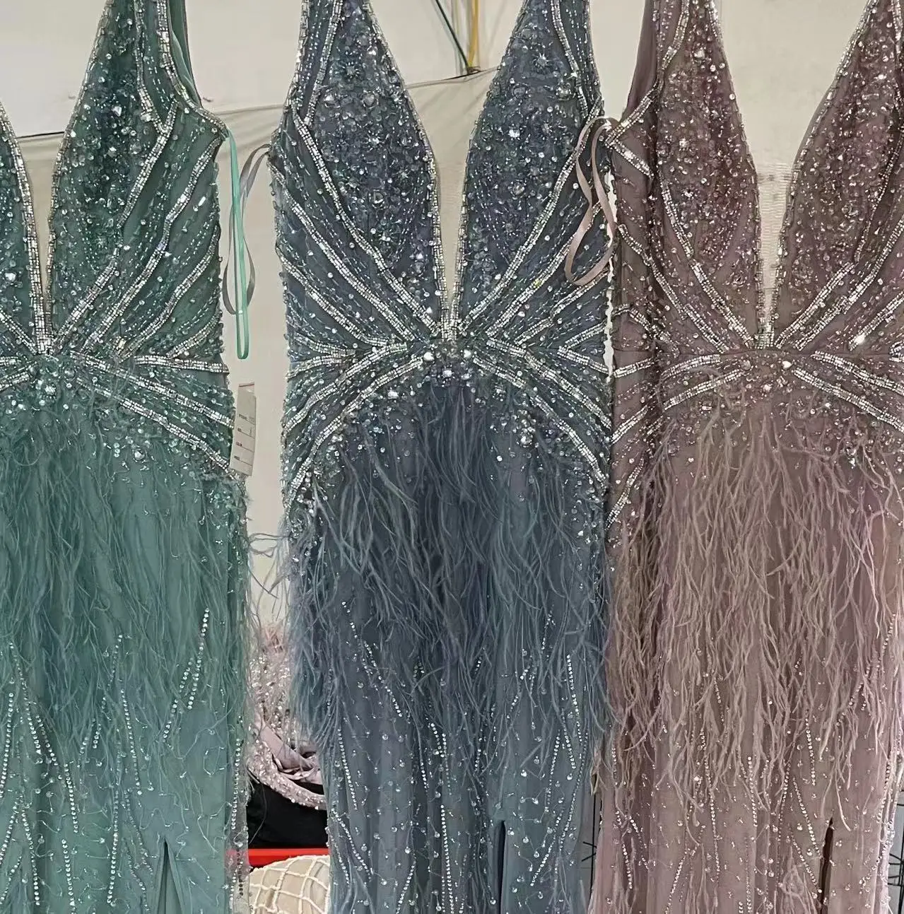 2022 New Handmade Beading Mermaid Evening Dresses With Feathers Sexy Split Long Evening Gowns for Women Party