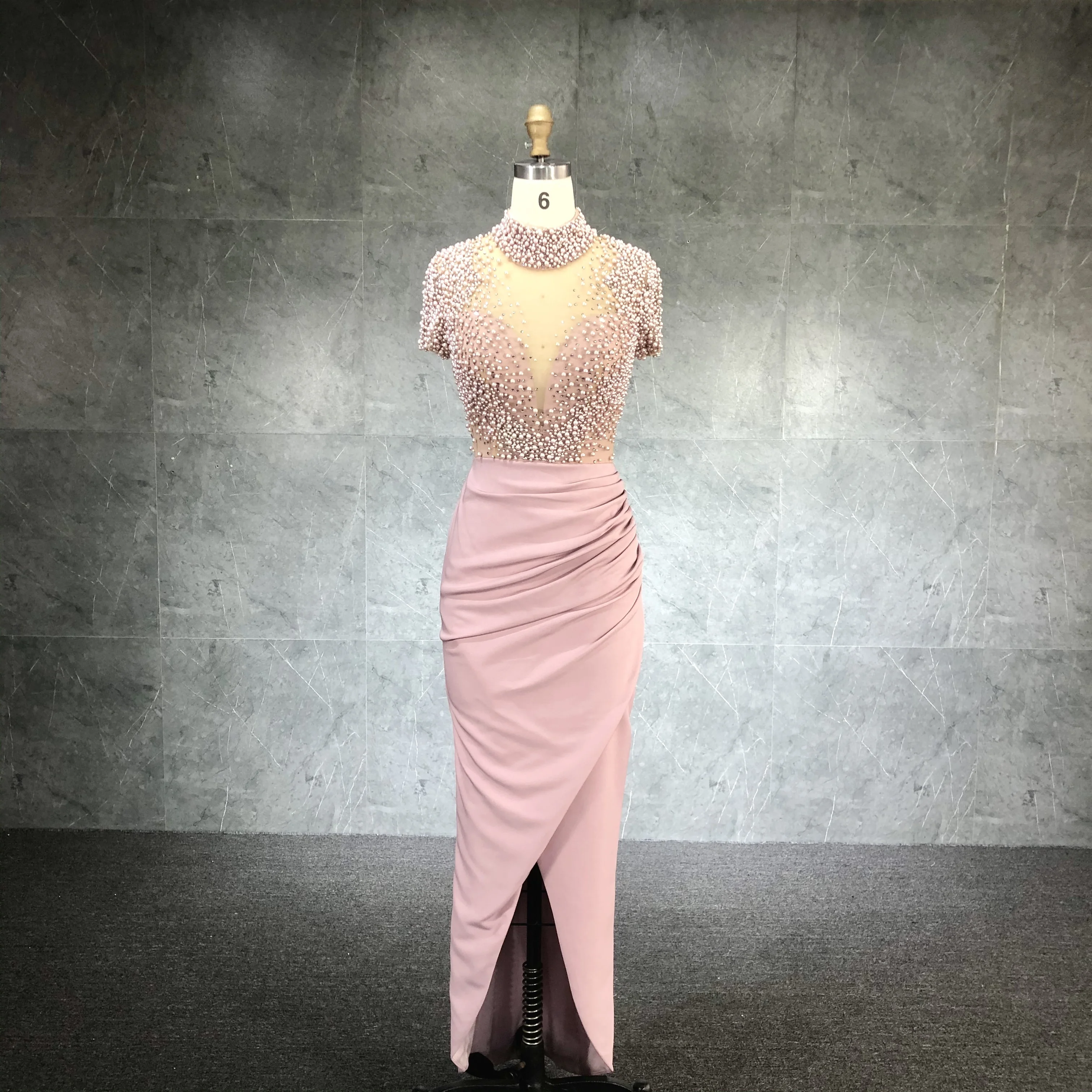 2022 Fashion Vestido De Novia Pearls Beaded Maxi Dress Short Sleeved Sexy Slit Women Party Gown Prom Dress