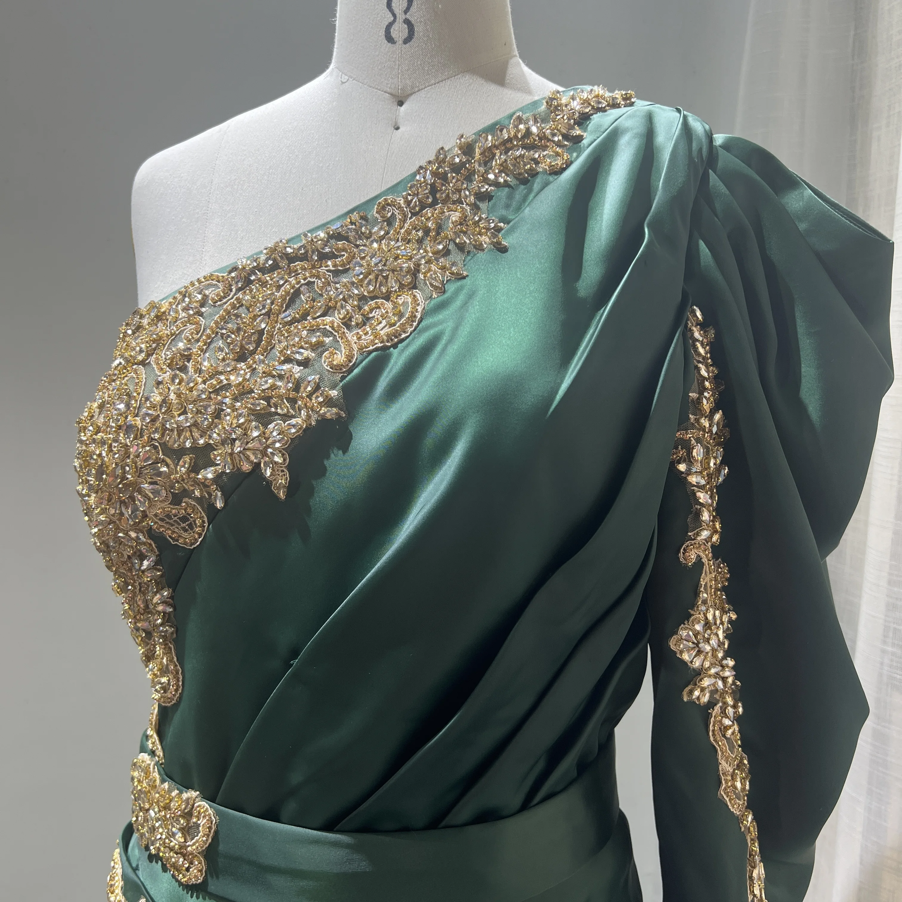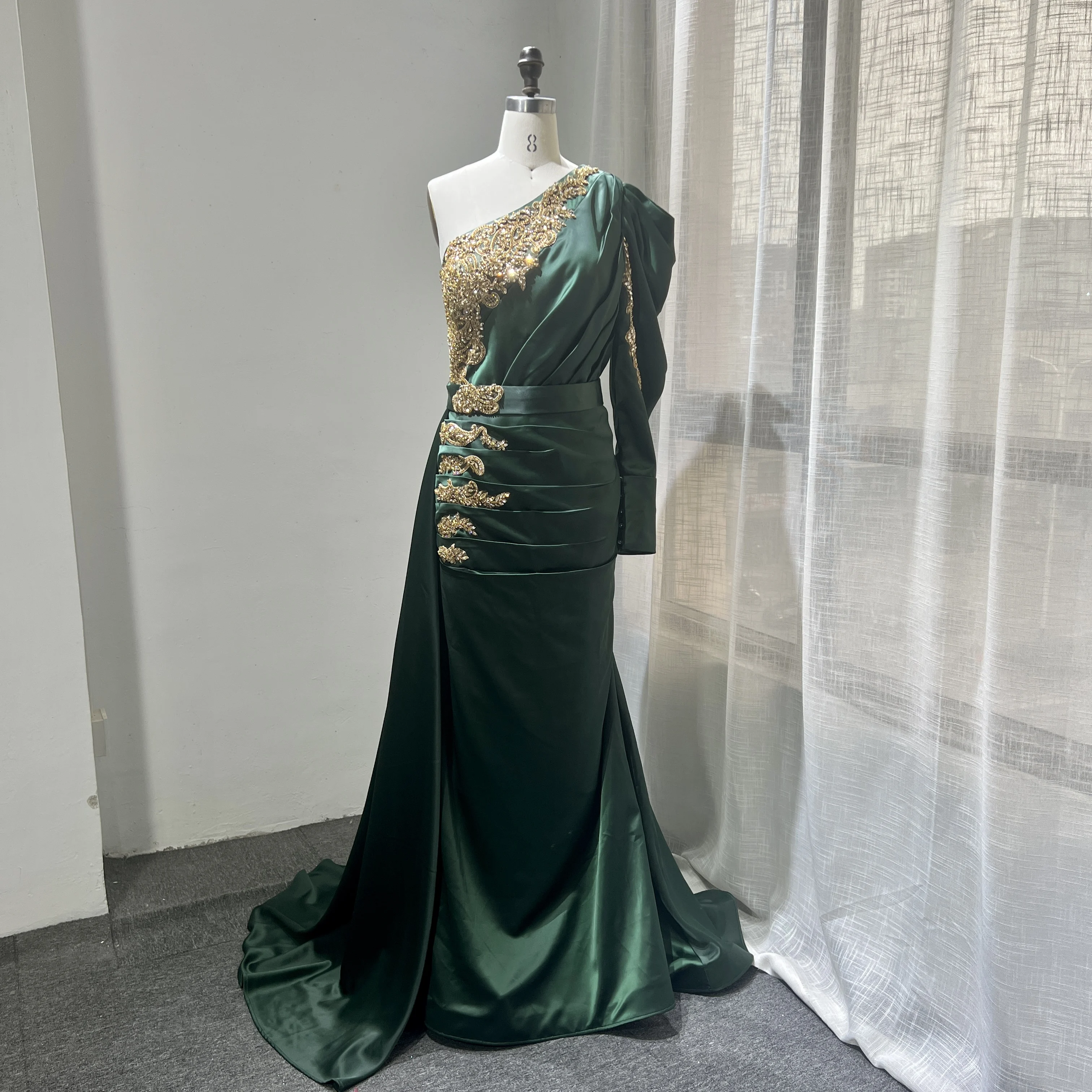 Modest One Shoulder Satin Evening Dresses 2022 Women Trumpet/Mermaid Handmade Beading Evening Gowns