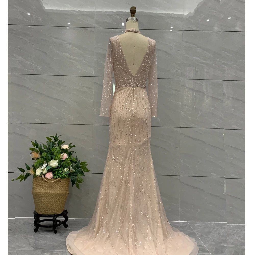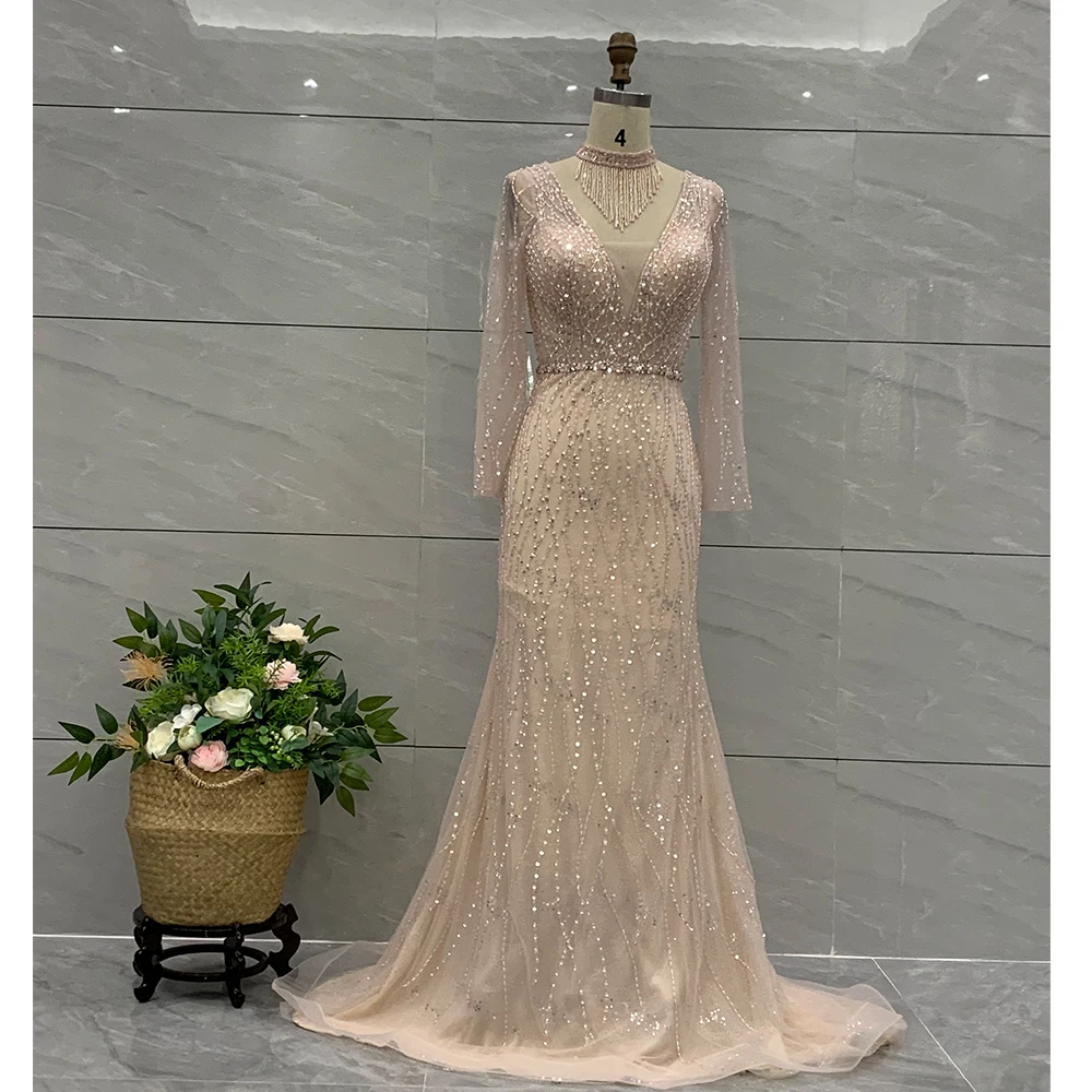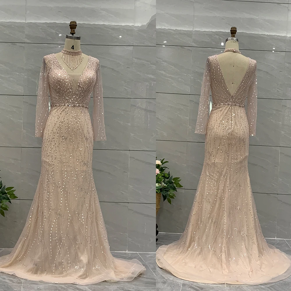 Pink Party Dresses Long V-neck Long Sleeve Sexy Rhinestone Slim Fit Elegant Gown