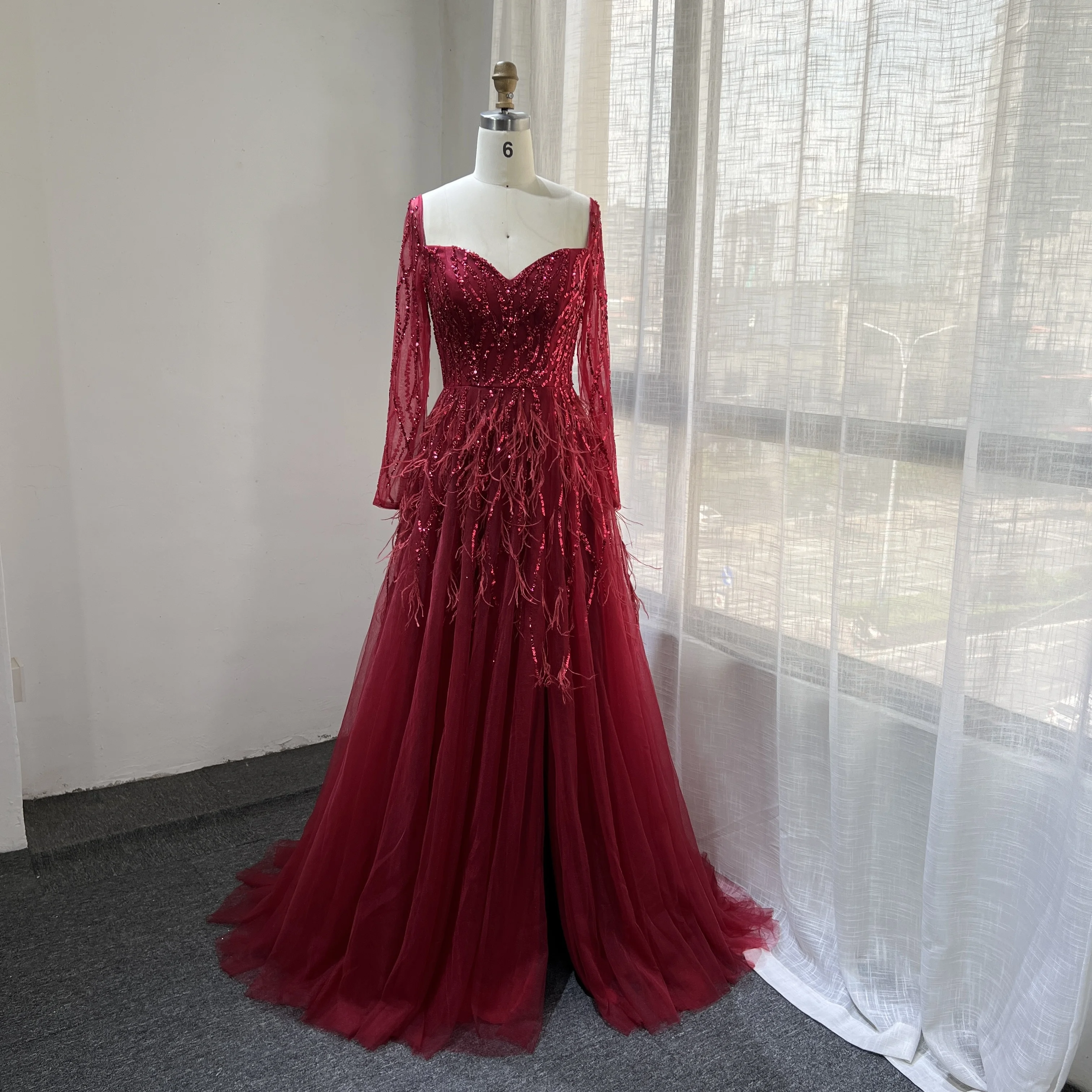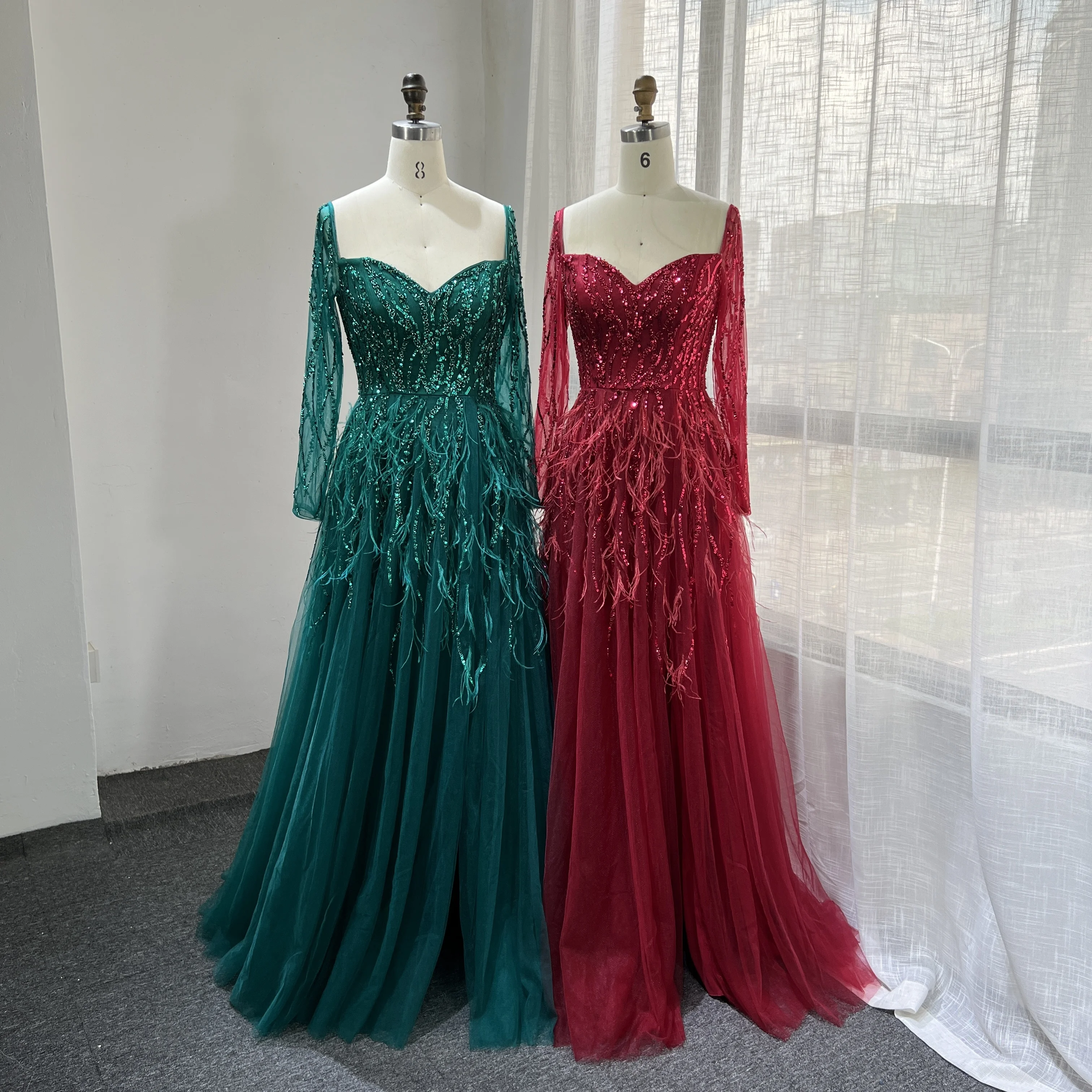 2022 Colors Long Sleeves a Line Beaded Feathers Evening Dresses Party Gowns for Women