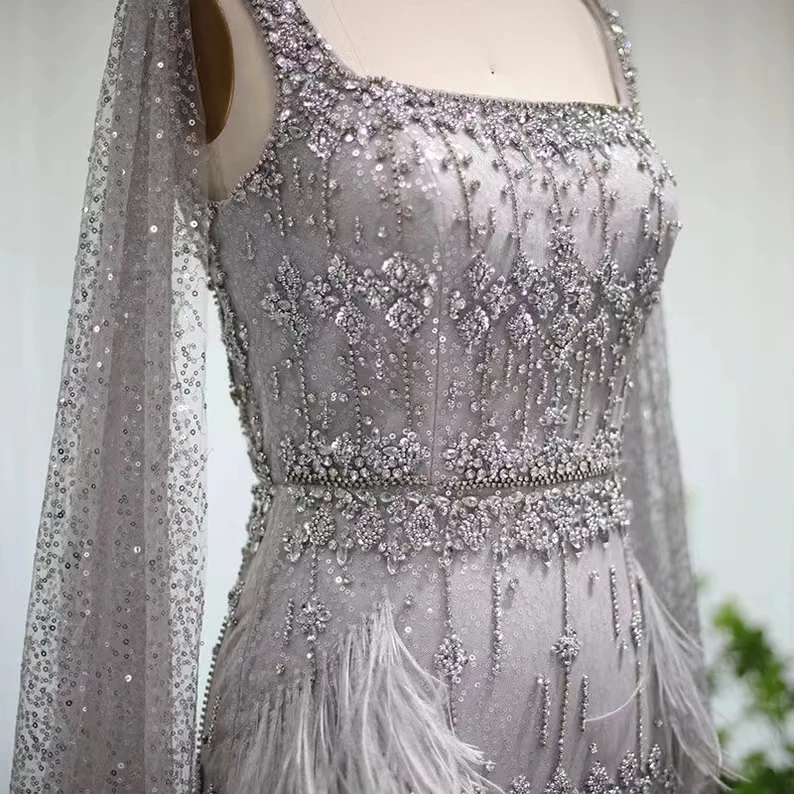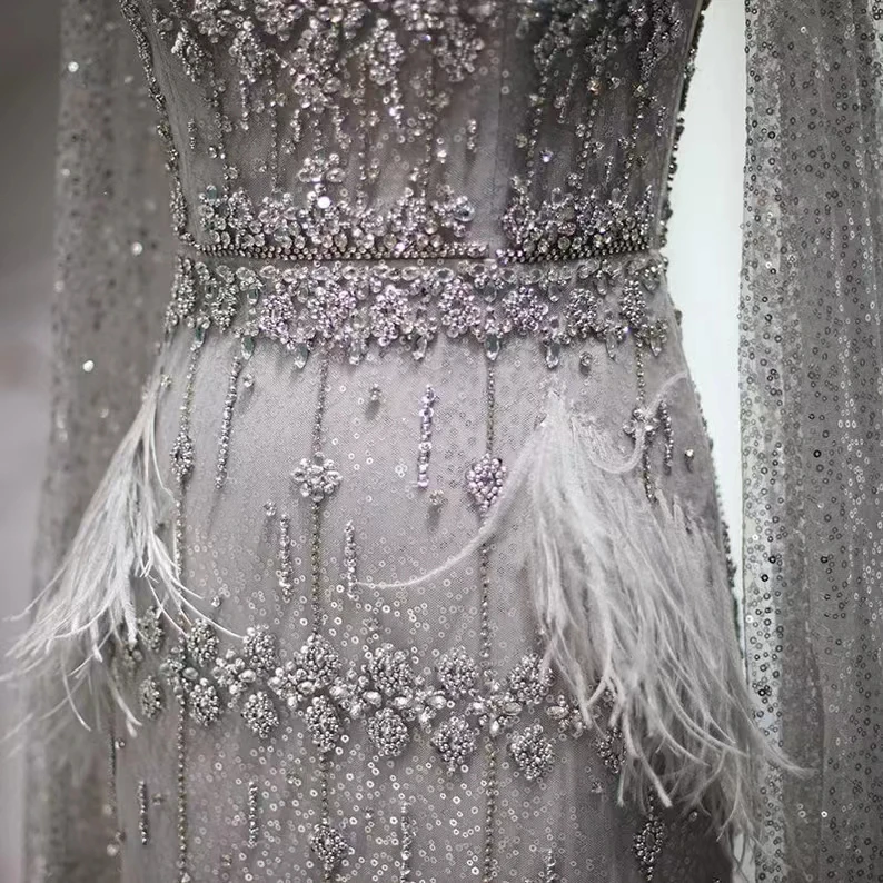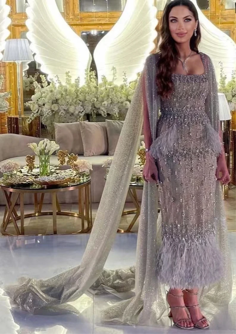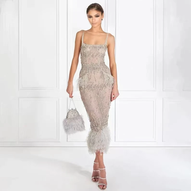 New Mermaid Fashionable Women Crystal Beading Midi Party Dresses High Quality Feather Evening Dresses