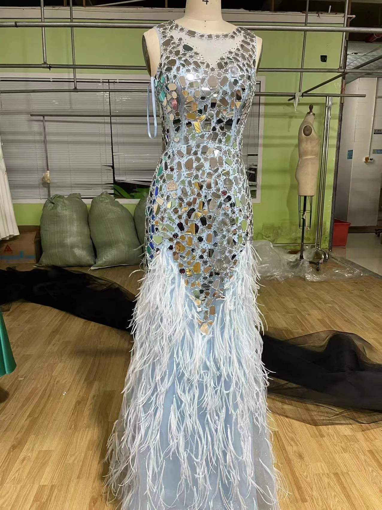 Sky Blue Beaded Mermaid Illusion Tulle Diamond Feather Crystal Evening Formal Dresses for Party Wear