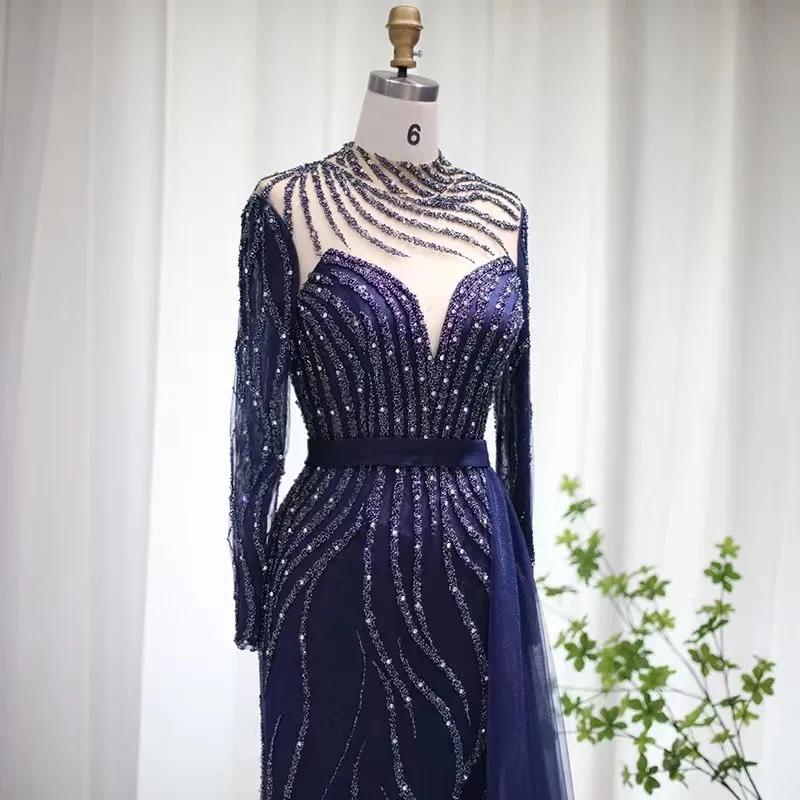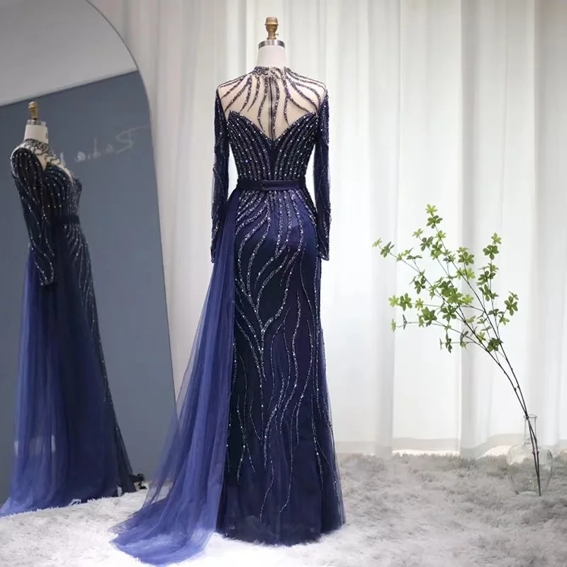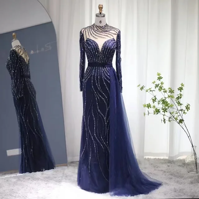 New Navy Blue Mermaid Dubai Evening Dress With Detachable Skirt Long Sleeve Arabic Formal Gowns for Women