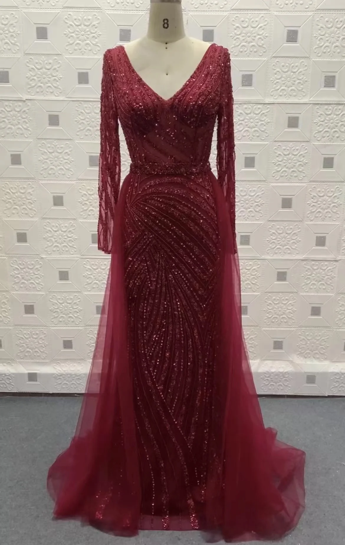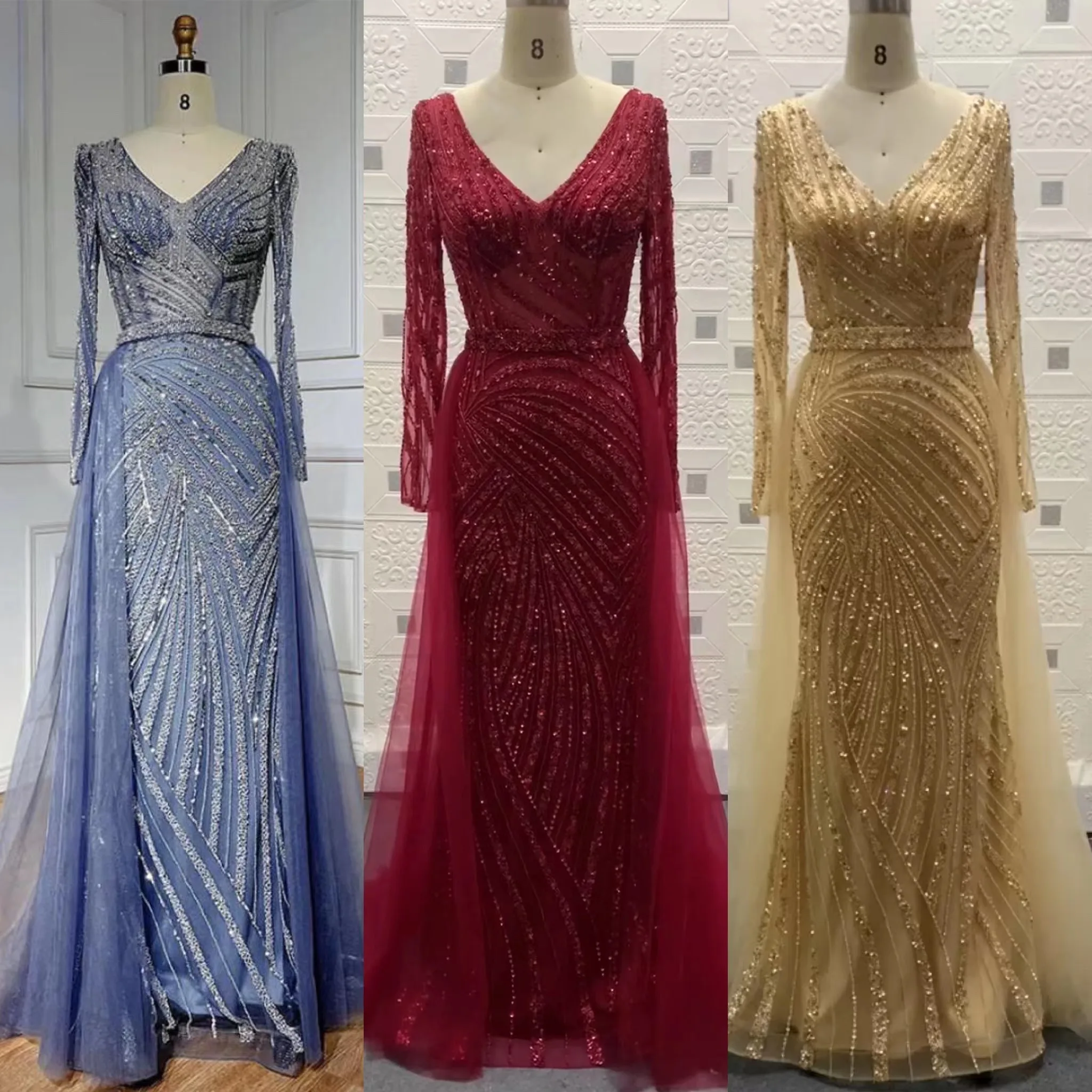 2023 Elegant Luxury Beaded V-Neck Long Sleeve Evening Gowns Muslim Party Dresses