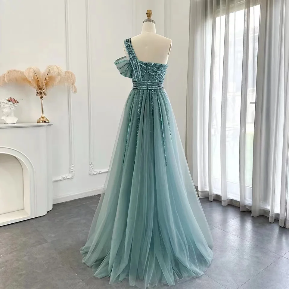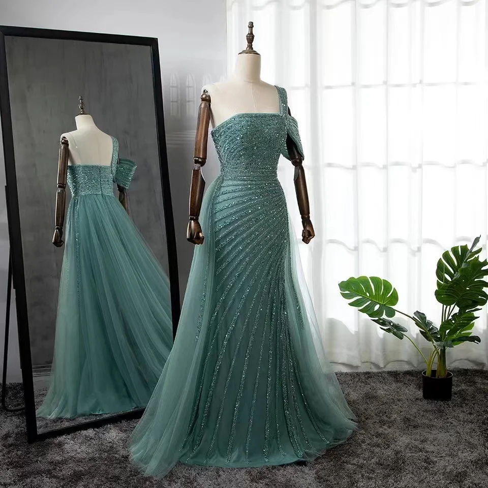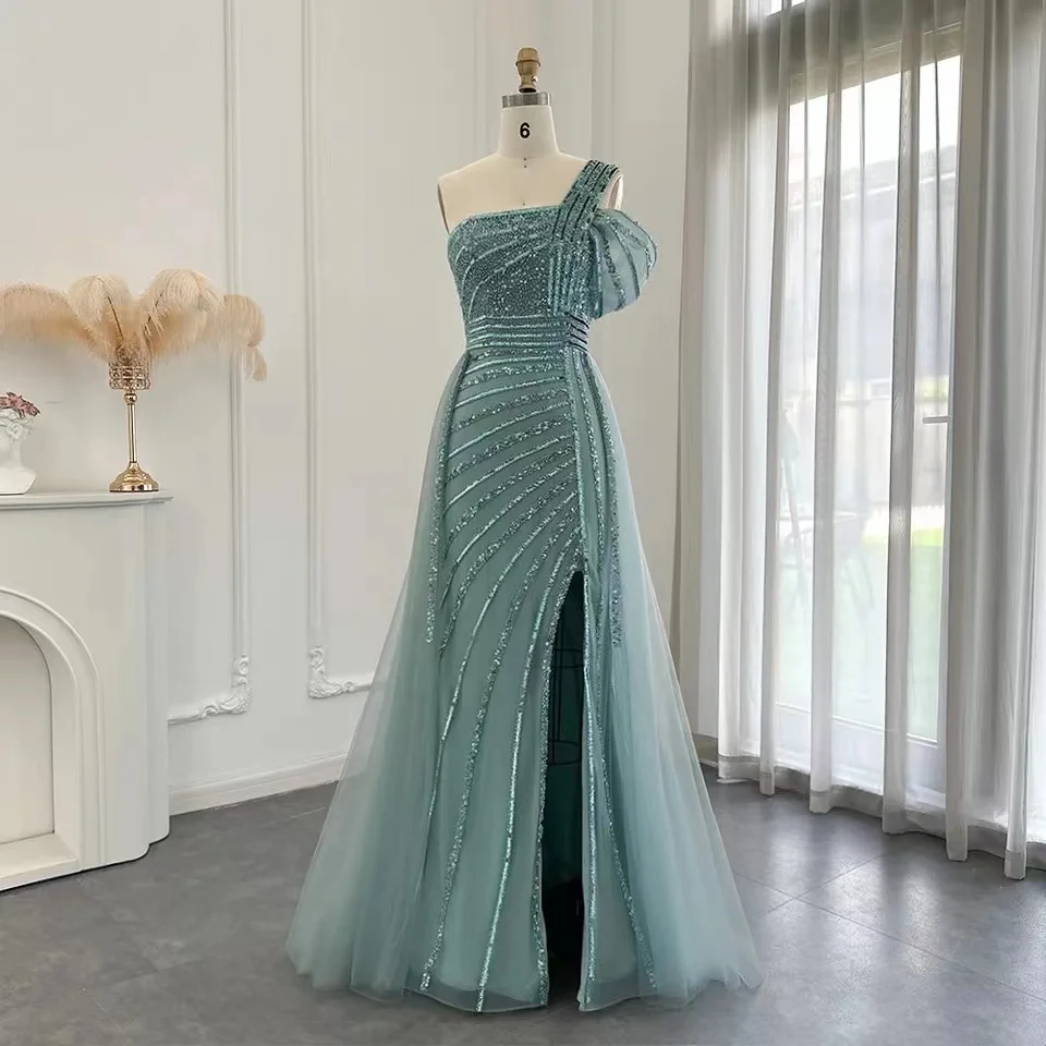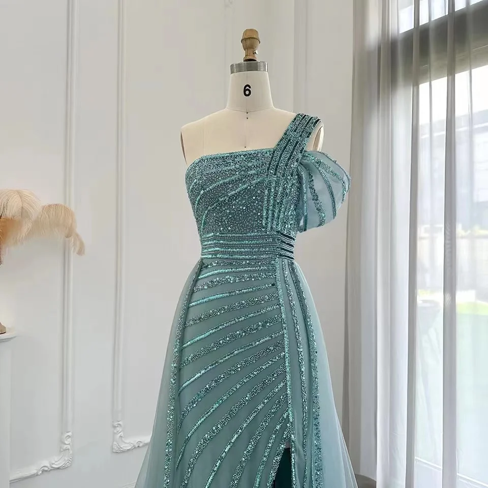 Turquoise Luxury One Shoulder Beading Evening Party Dress With Overskirt Side Slit Sexy Long Prom Dress