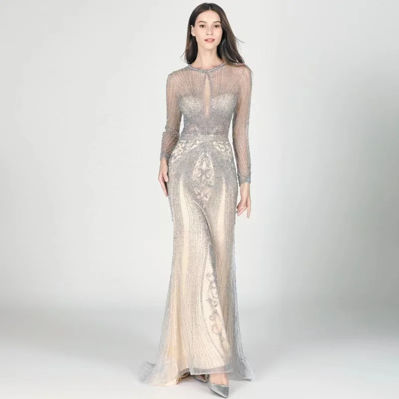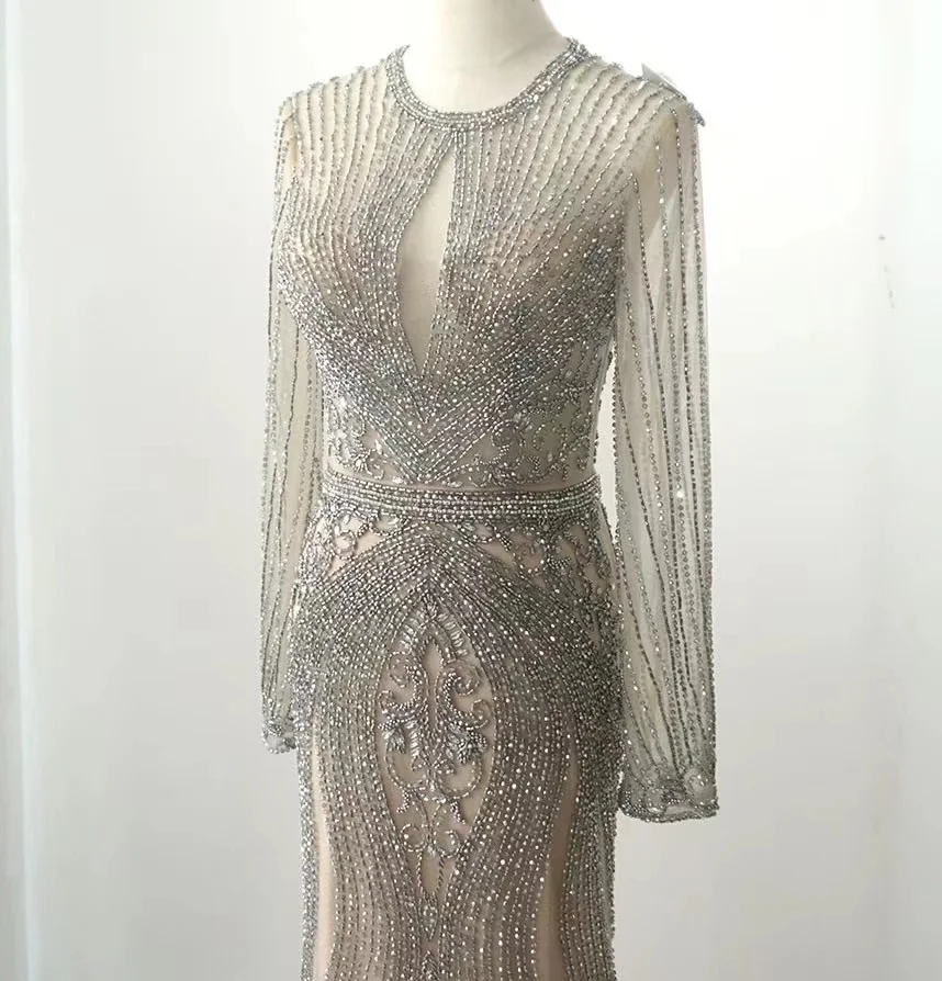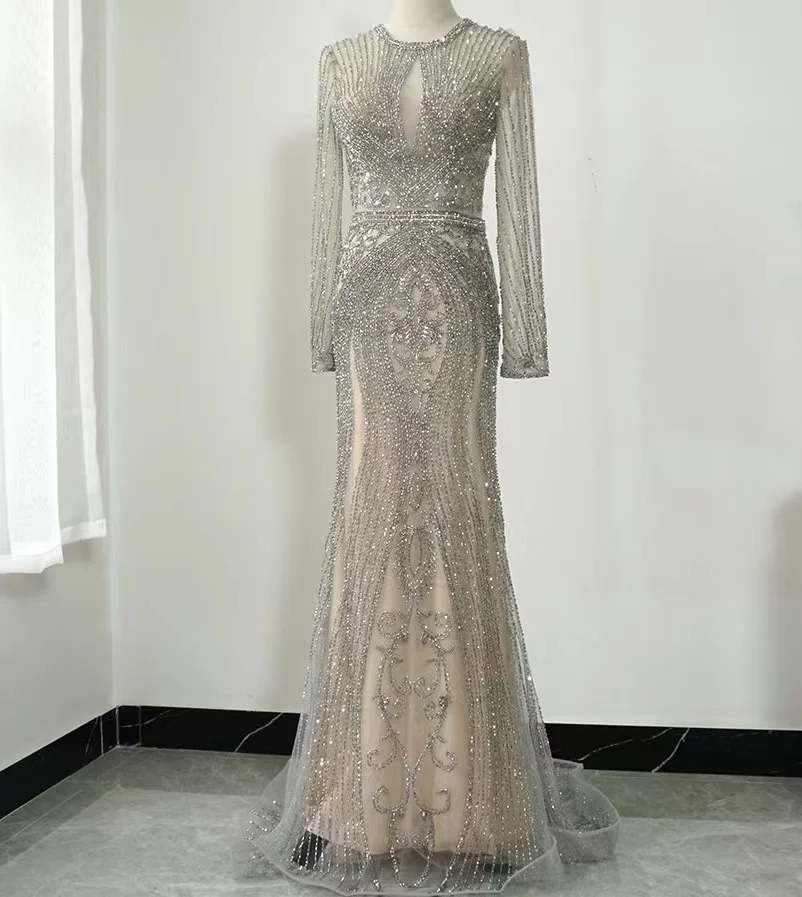 Dubai Long Sleeves Silver Grey Luxury Evening Dresses O-Neck Full Diamond Mermaid Formal Dress