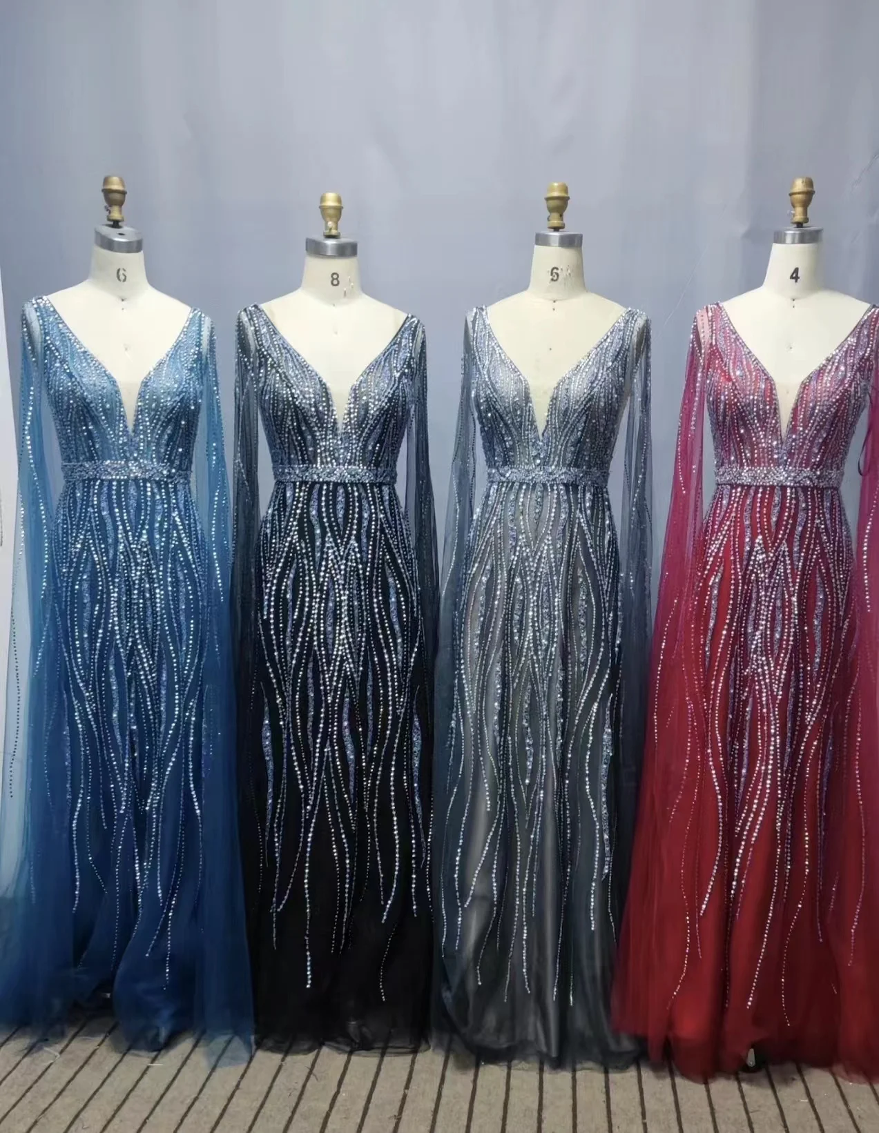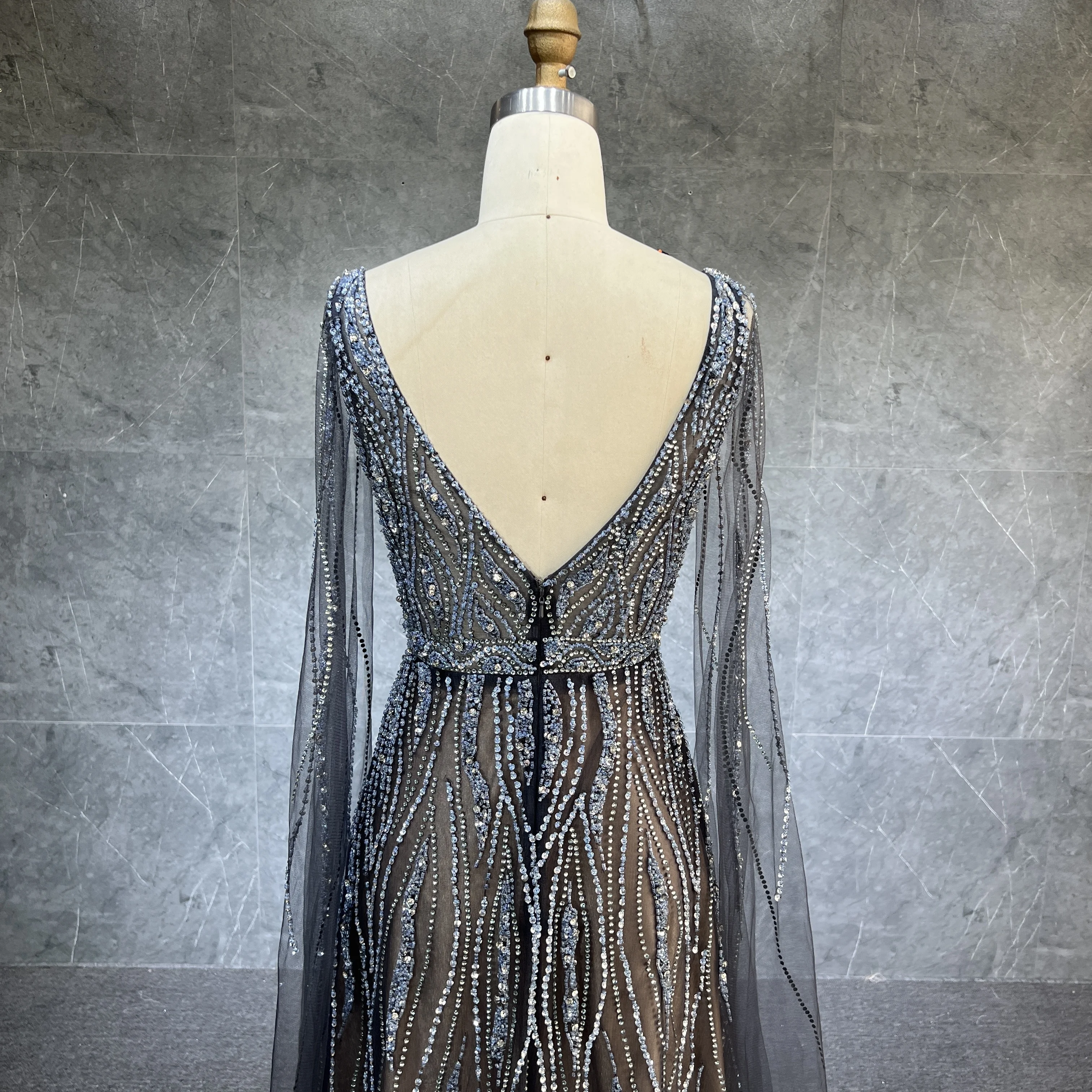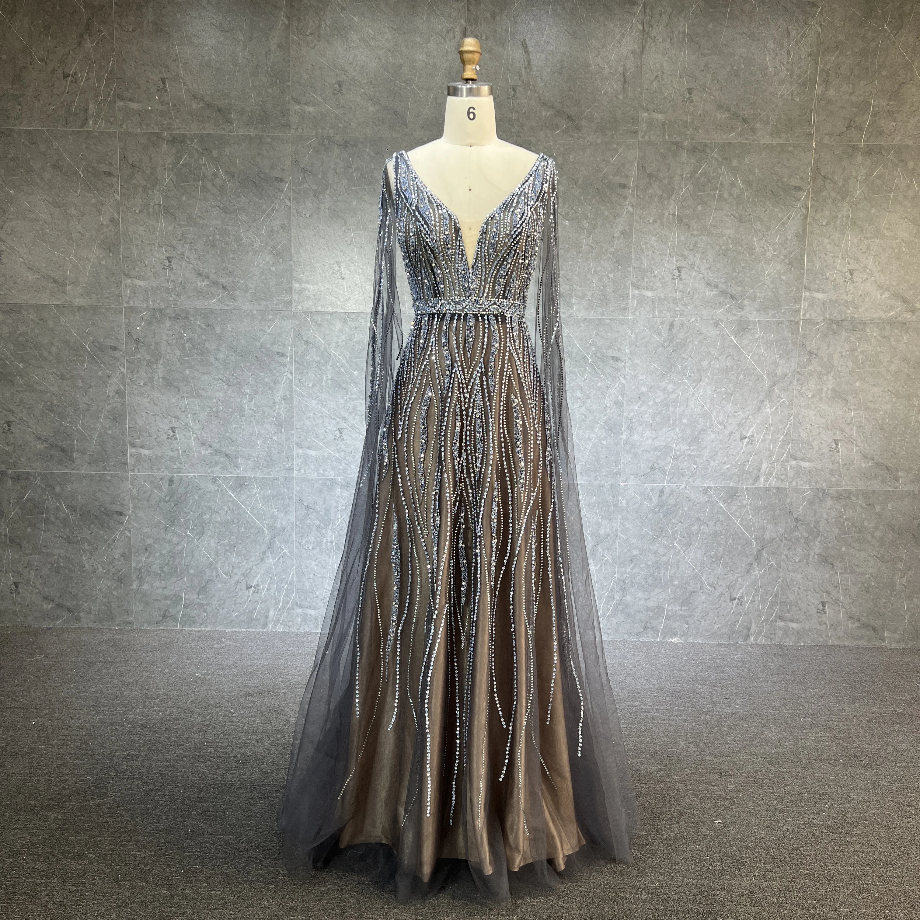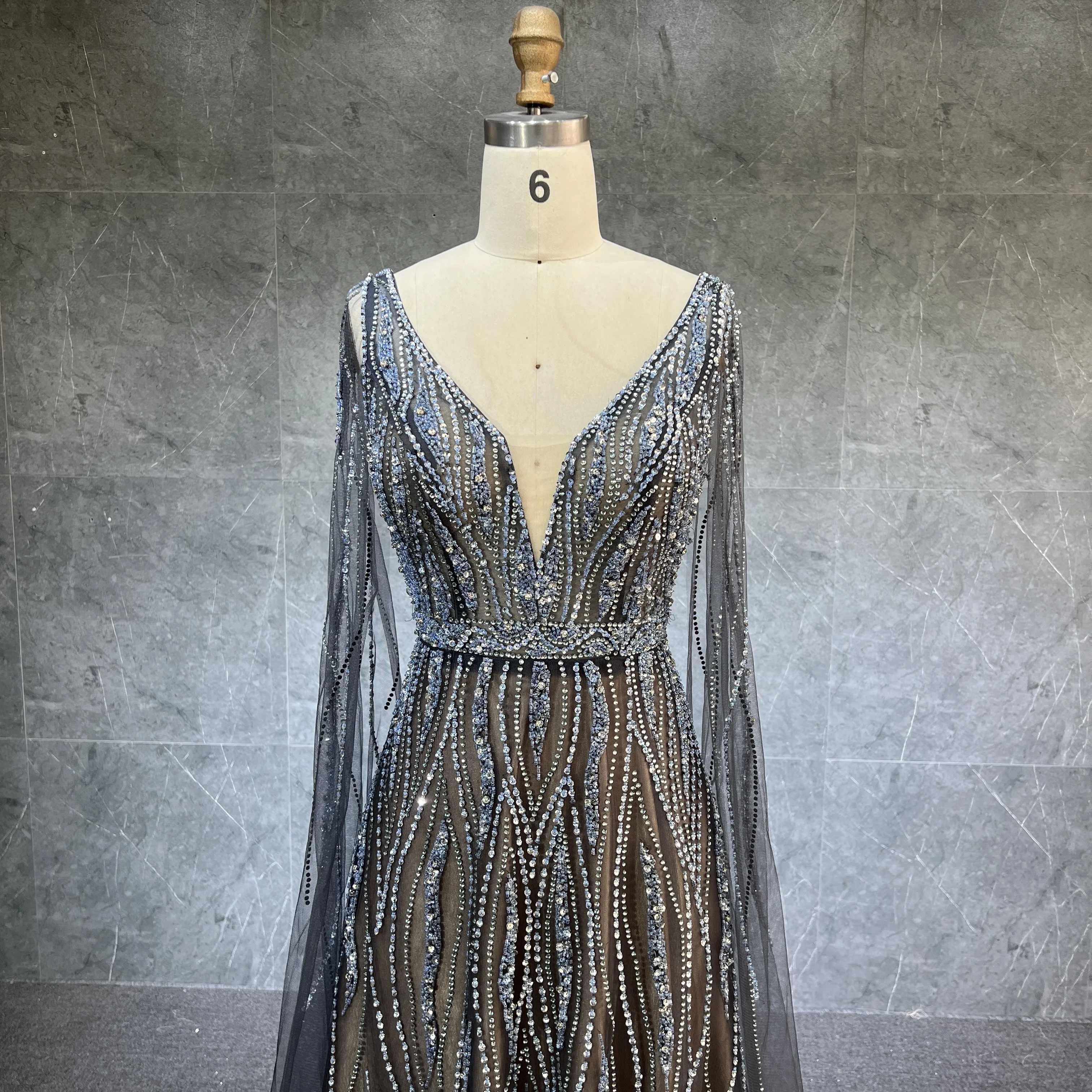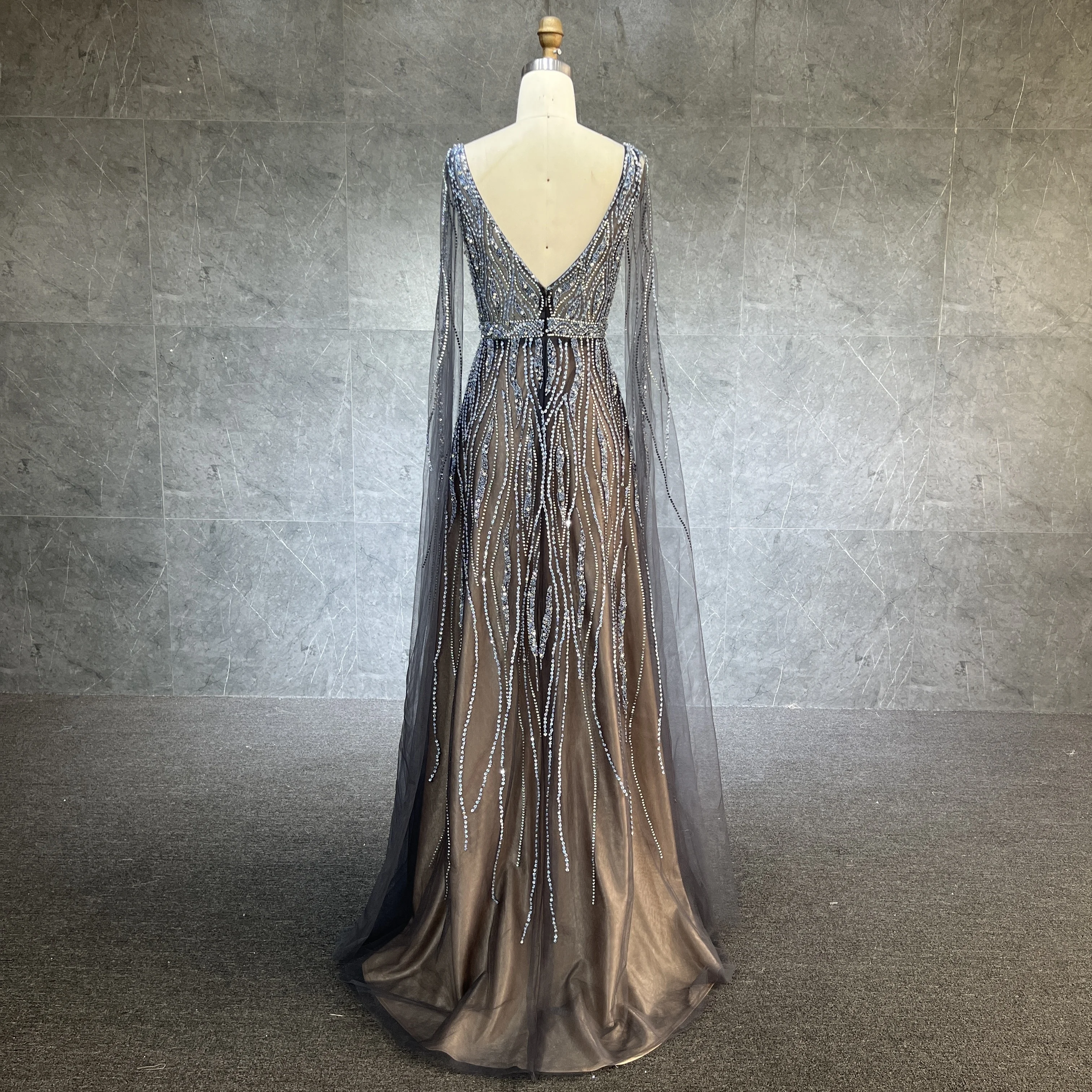 Luxury Dubai Black Arabic Evening Dress With Cape Sleeves Elegant Blue Red Grey Women Wedding Formal Party Gown