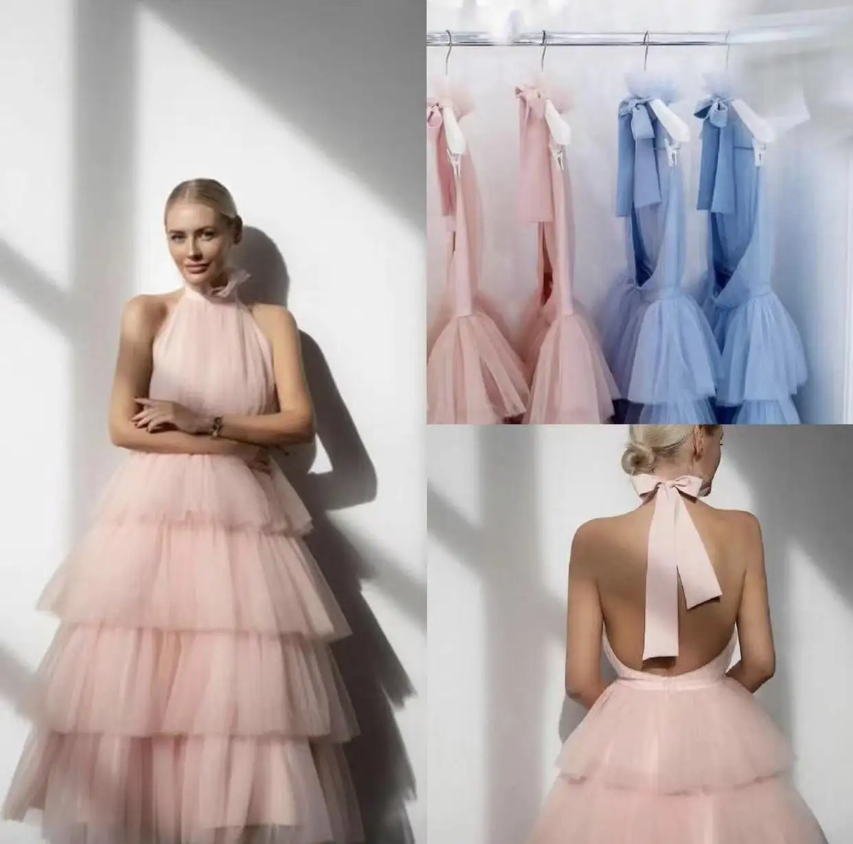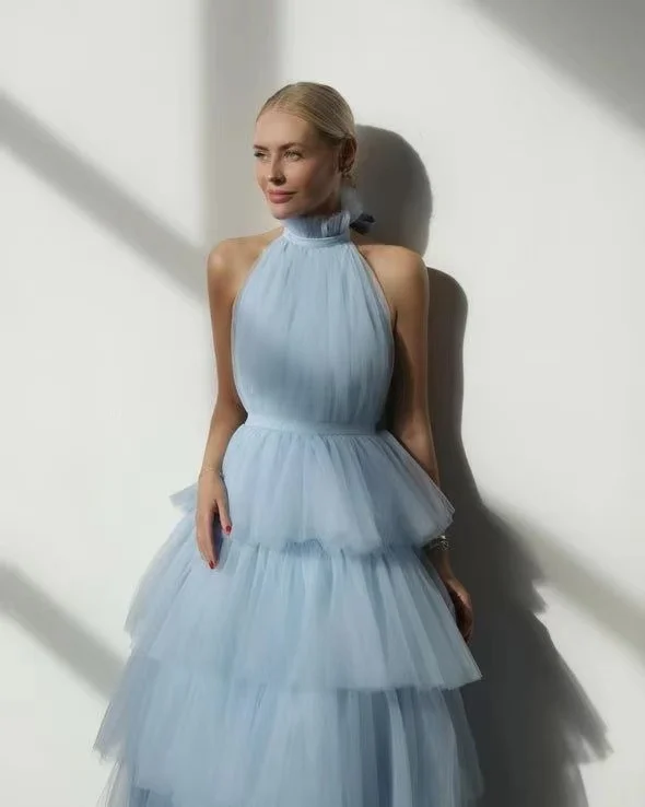Birthday Party Gown Tea Length Pleated a Line Tulle Pink Halter Bacs Pklesrom Dresses for Women