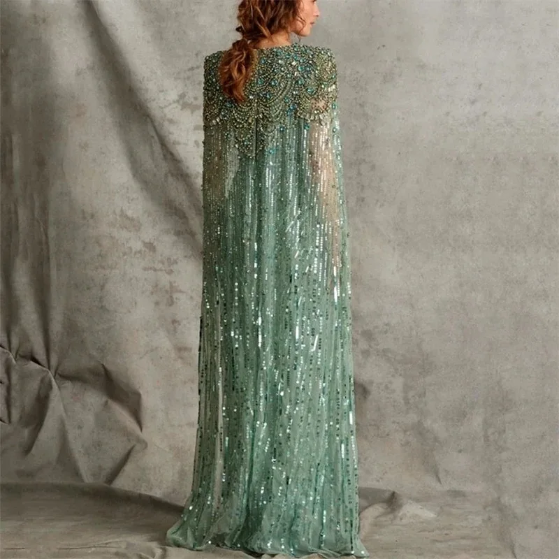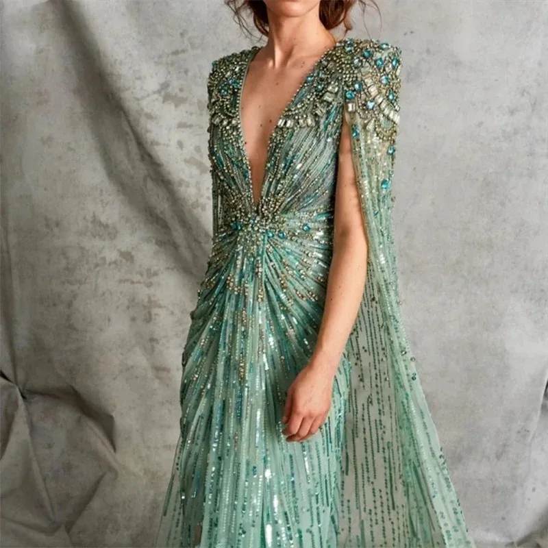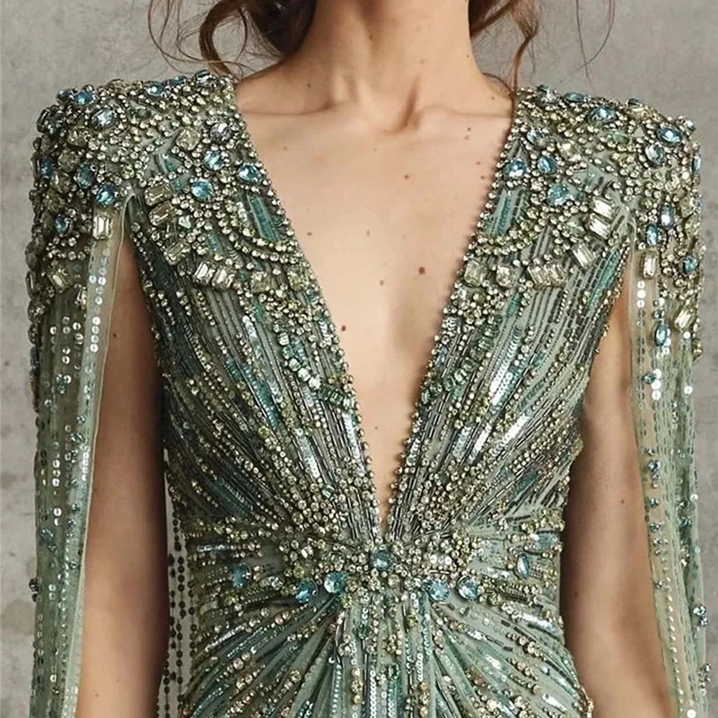 Green Evening Dresses Luxury Dubai With Cape Fuchsia Crystal Gold Mermaid Women Wedding Formal Party Gownlle Adults