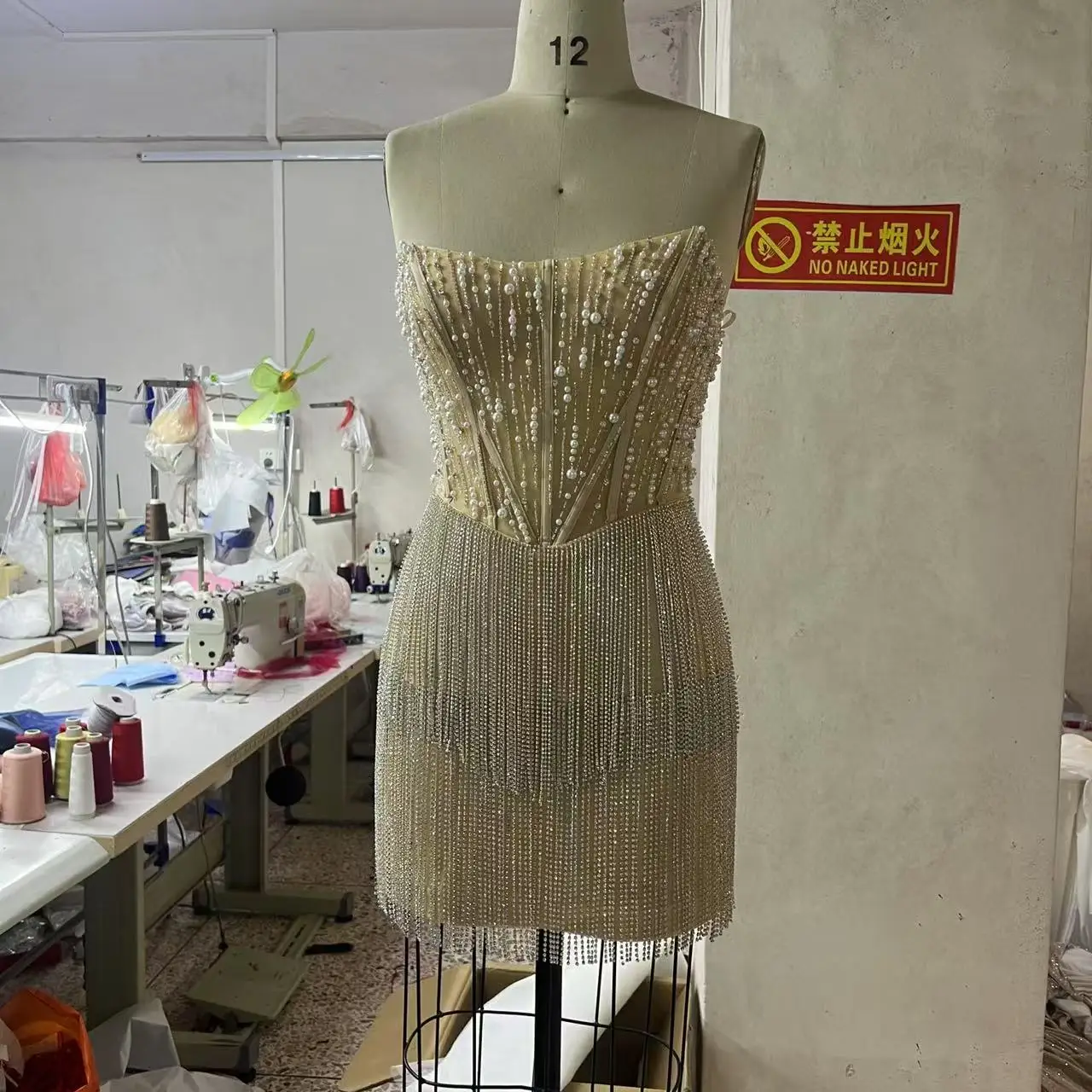 Silver Sexy New Mini Dress Tassel Pearl Stripe Mini Cocktail Party Slim Fit Evening Dress High Waist Sleeveless Strapless