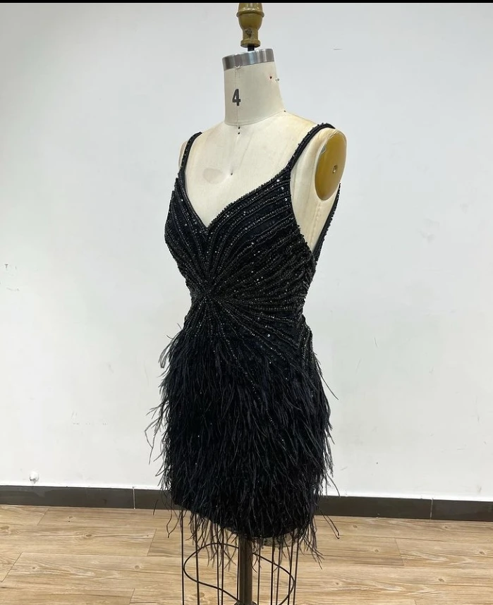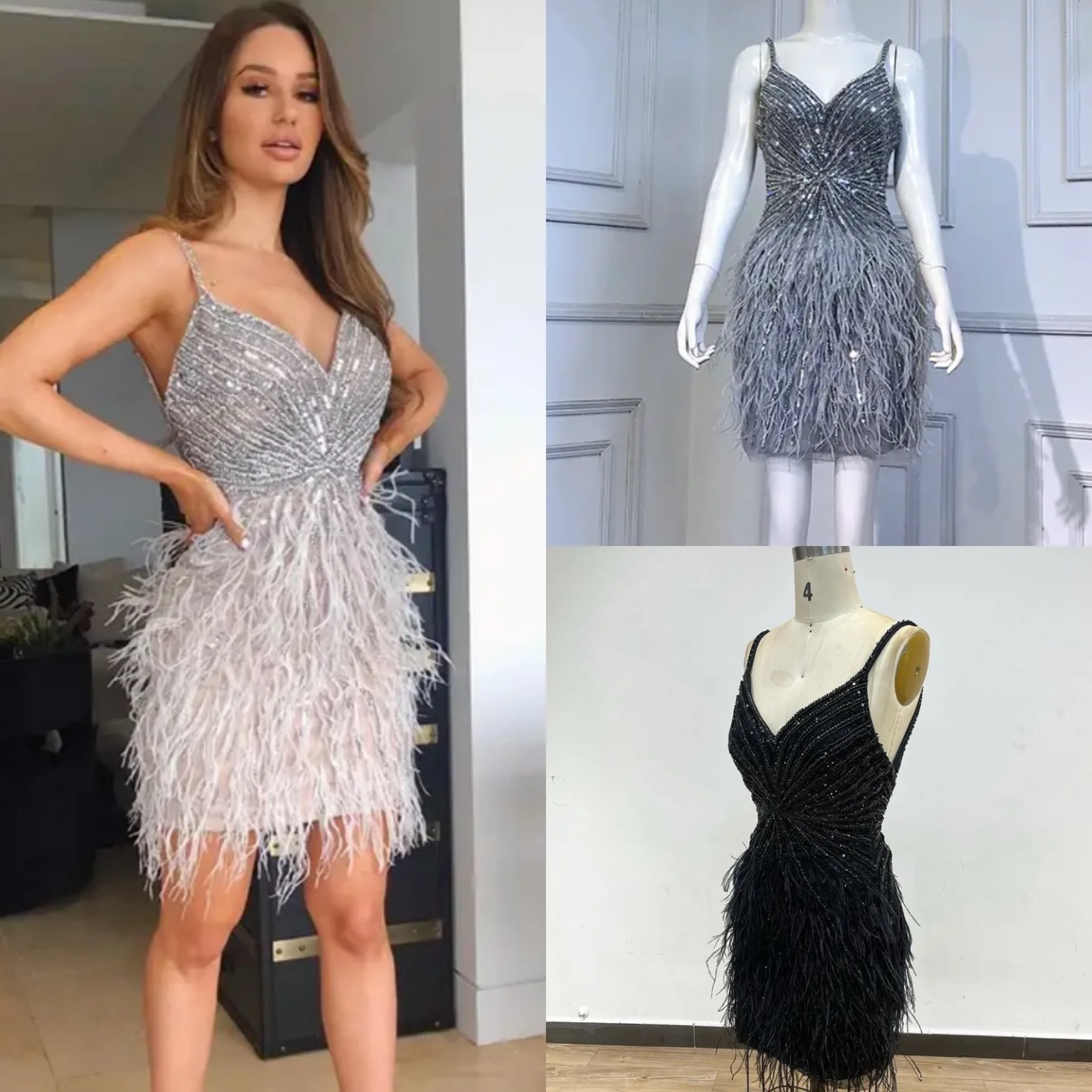 New Short Luxury Beaded Gown With Feathers Sexy Split Thigh Sheer Long Elegant Evening Dresses