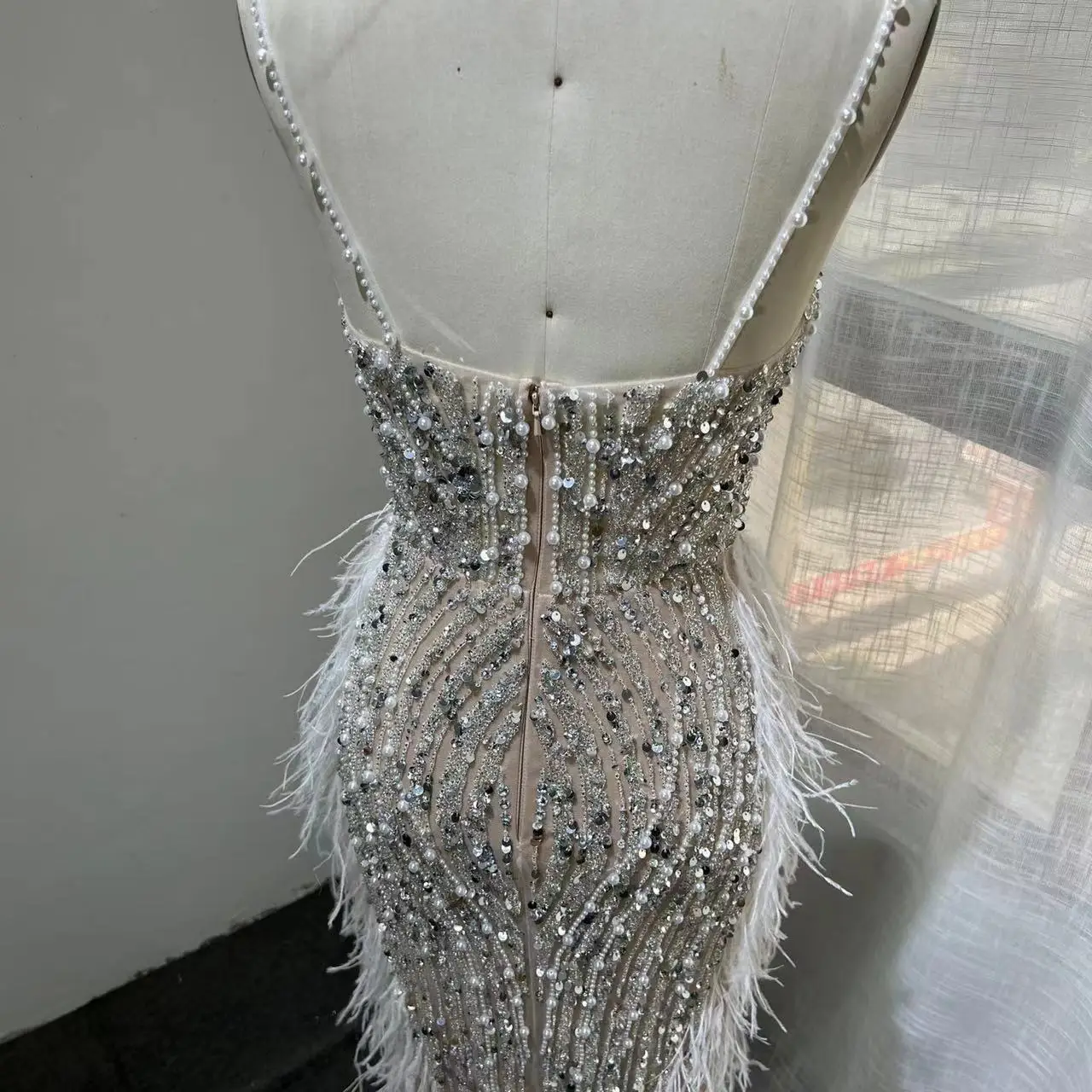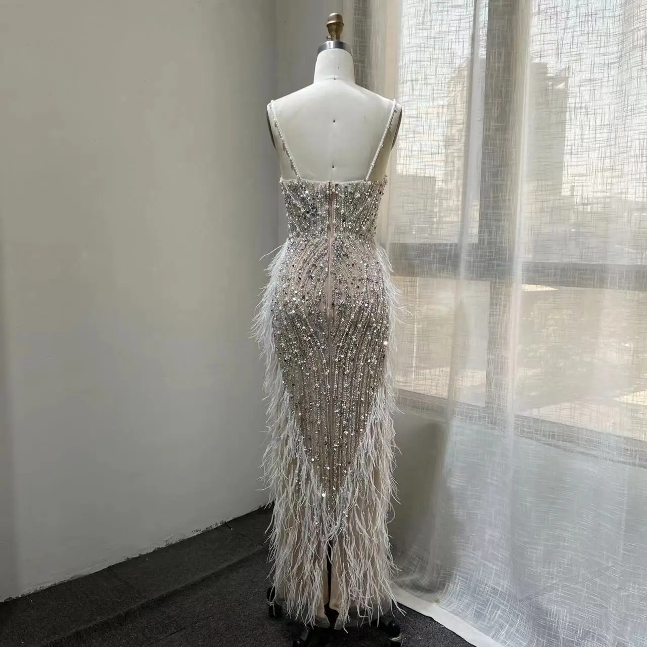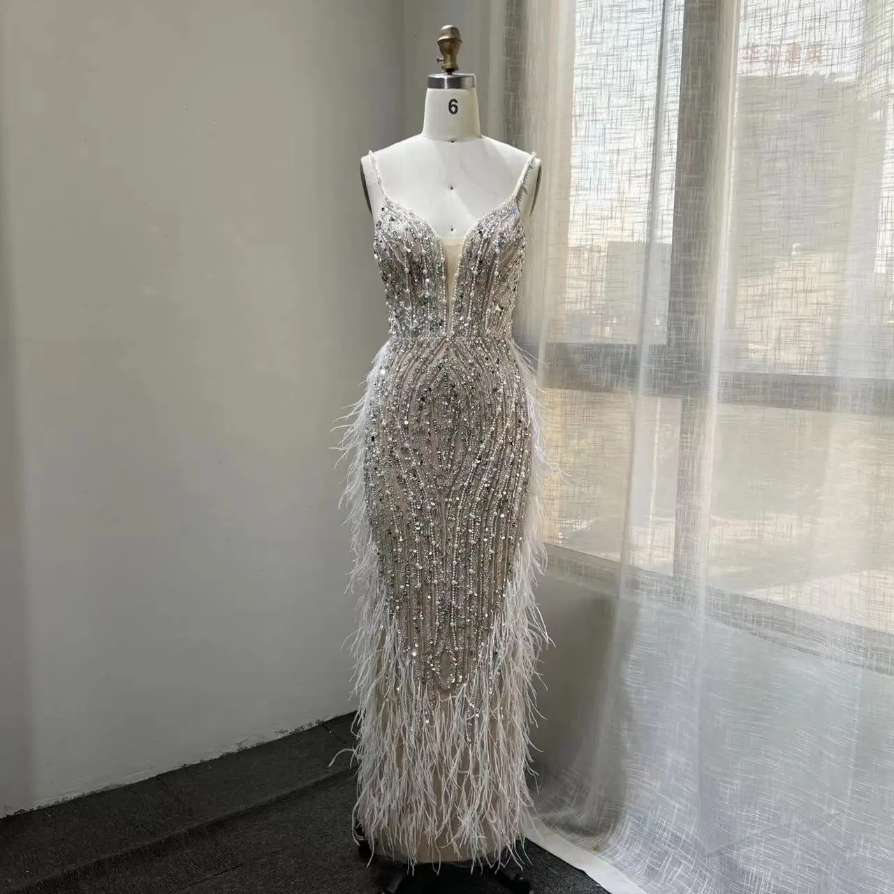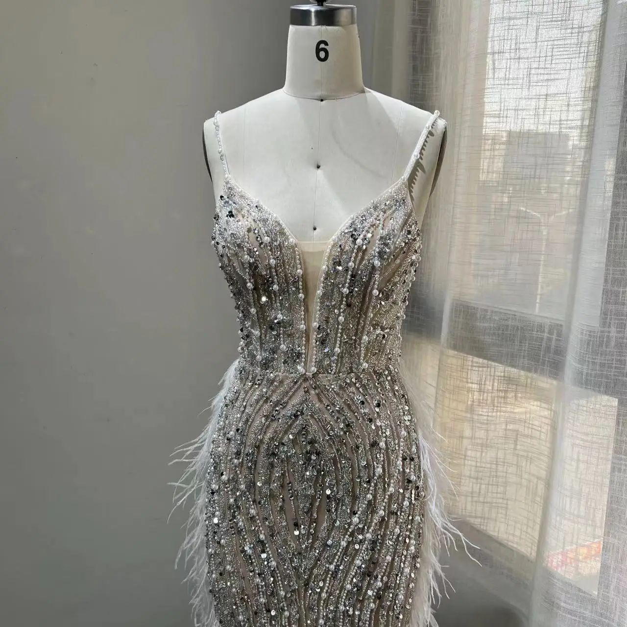 White Nude Mermaid Spaghetti Strap Beaded Feather Evening Dresses Prom Gowns 2024 for Woman Wedding Party