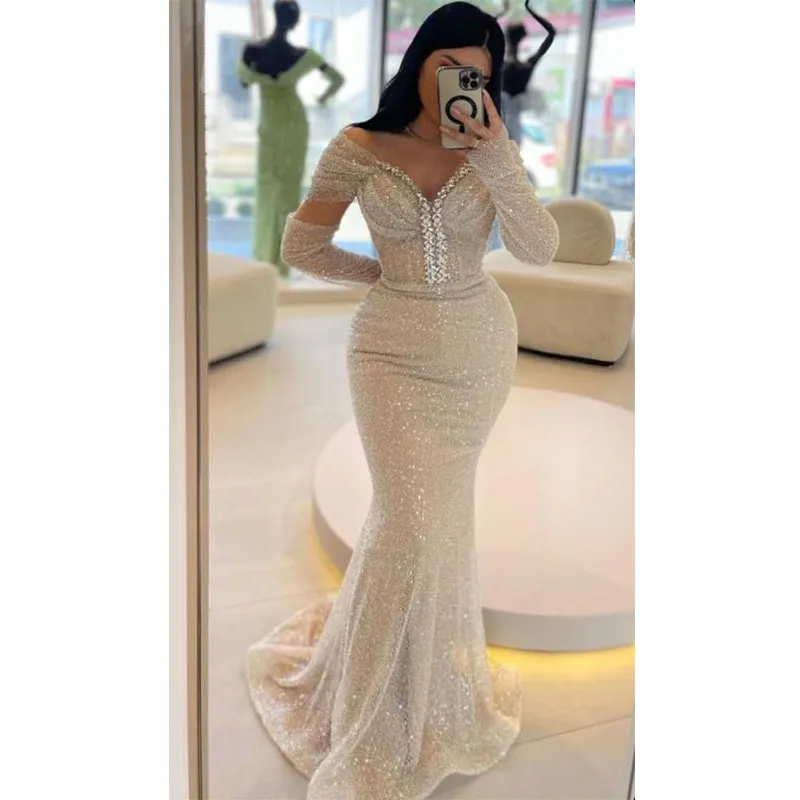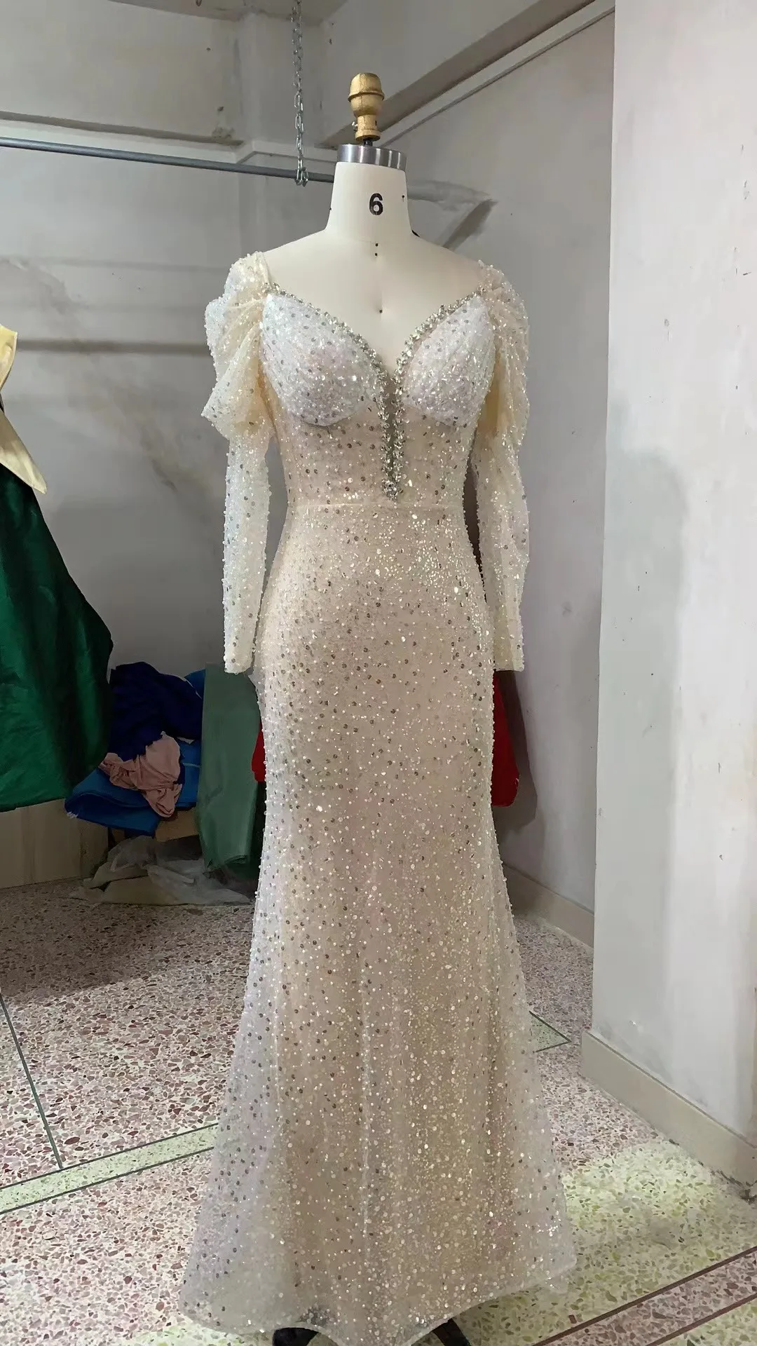 Light Champagne Pearls Evening Dress Women 2024 Mermaid Dress With Gloves Formal Prom Dresses