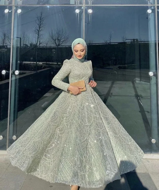 Muslim Glitter Sequined Evening Dresses Organza Formal Party Prom Gowns Long Sleeves Luxury Dubai Vestido De Fiesta