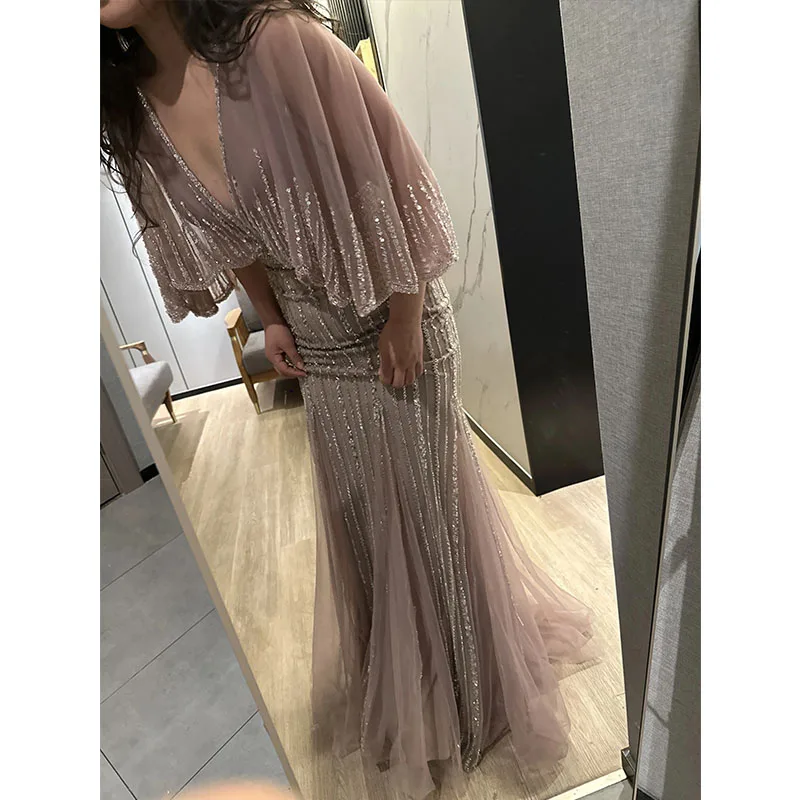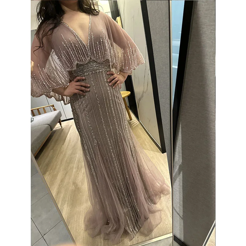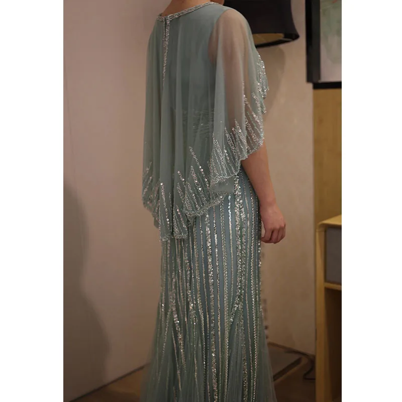 Turquoise V-Neck Mermaid Elegant Long Cape Beaded Luxury Dubai Evening Dresses Gowns for Women Wedding Party 2024