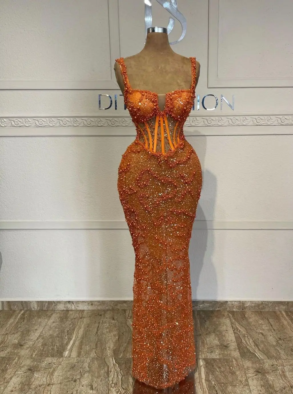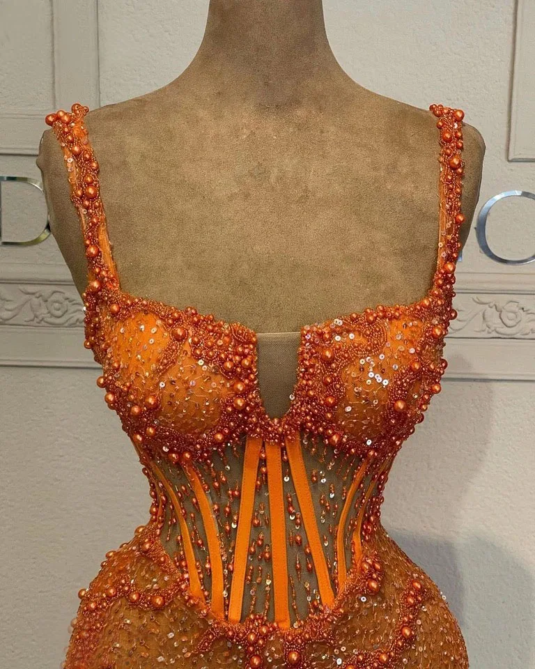 Orange Prom Dresses Mermaid Strapless Simple Cocktail Dresses With Pearls Beach Birthday Dresses Vestidos De Noche