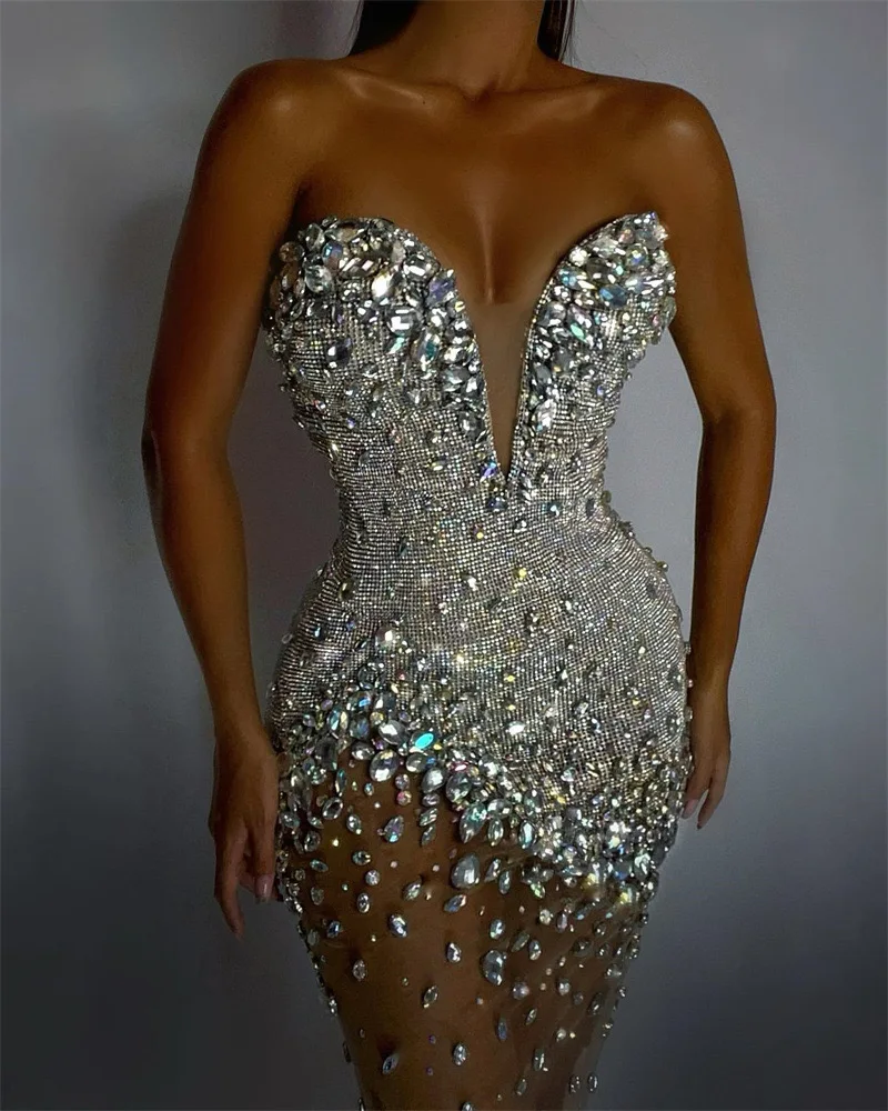 Sparkly Diamonds Silver Sexy Strapless Backless Beading Mini Gowns Dress Elegant Evening Party Club Dress
