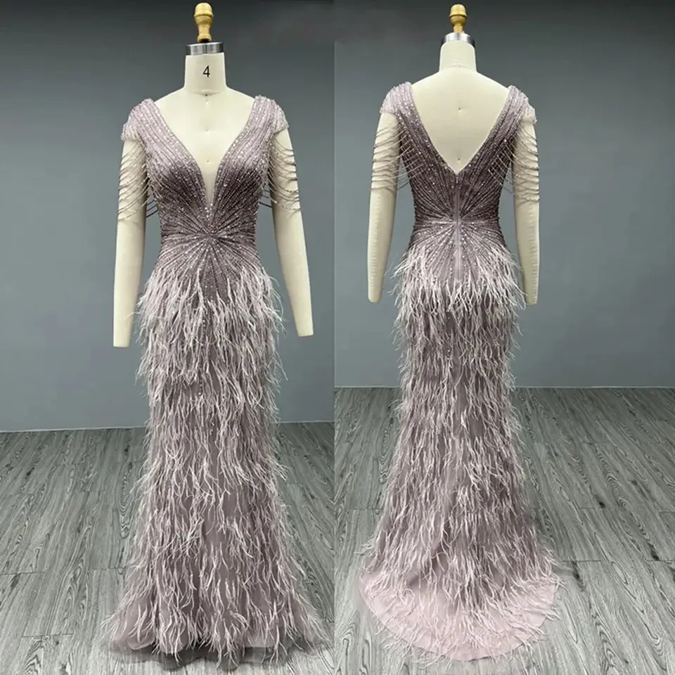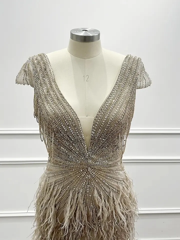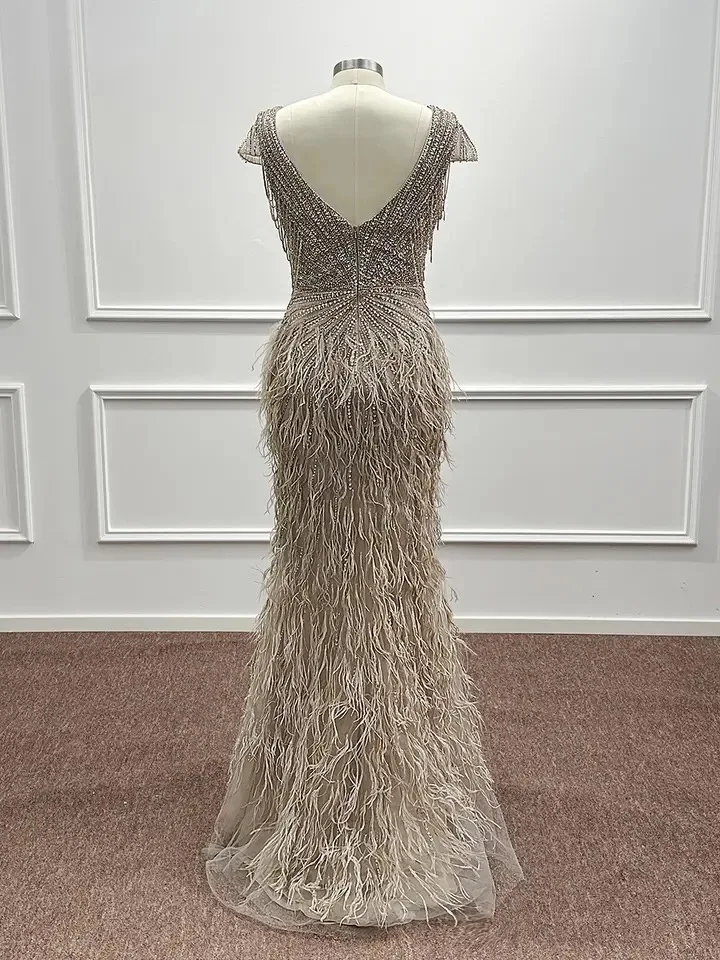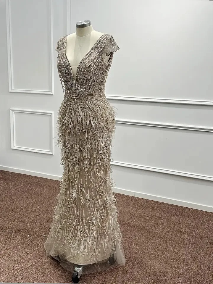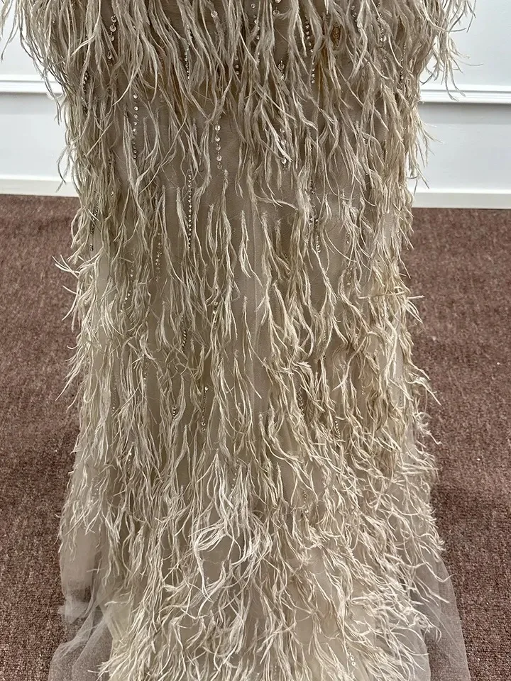 Luxury Dubai Champagne Feathers Evening Dress Mermaid Prom Formal Dress for Women Wedding Party Gown