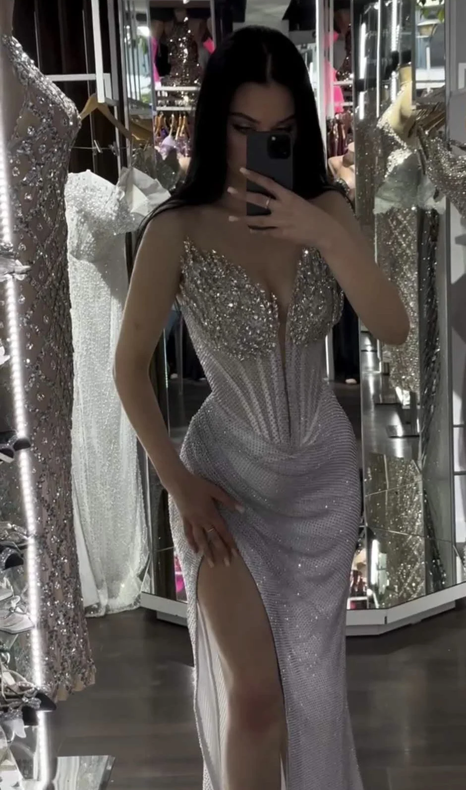 Silver Ladies Sexy Evening Dress Sleeveless With Front Slit Beaded Long Prom Dress