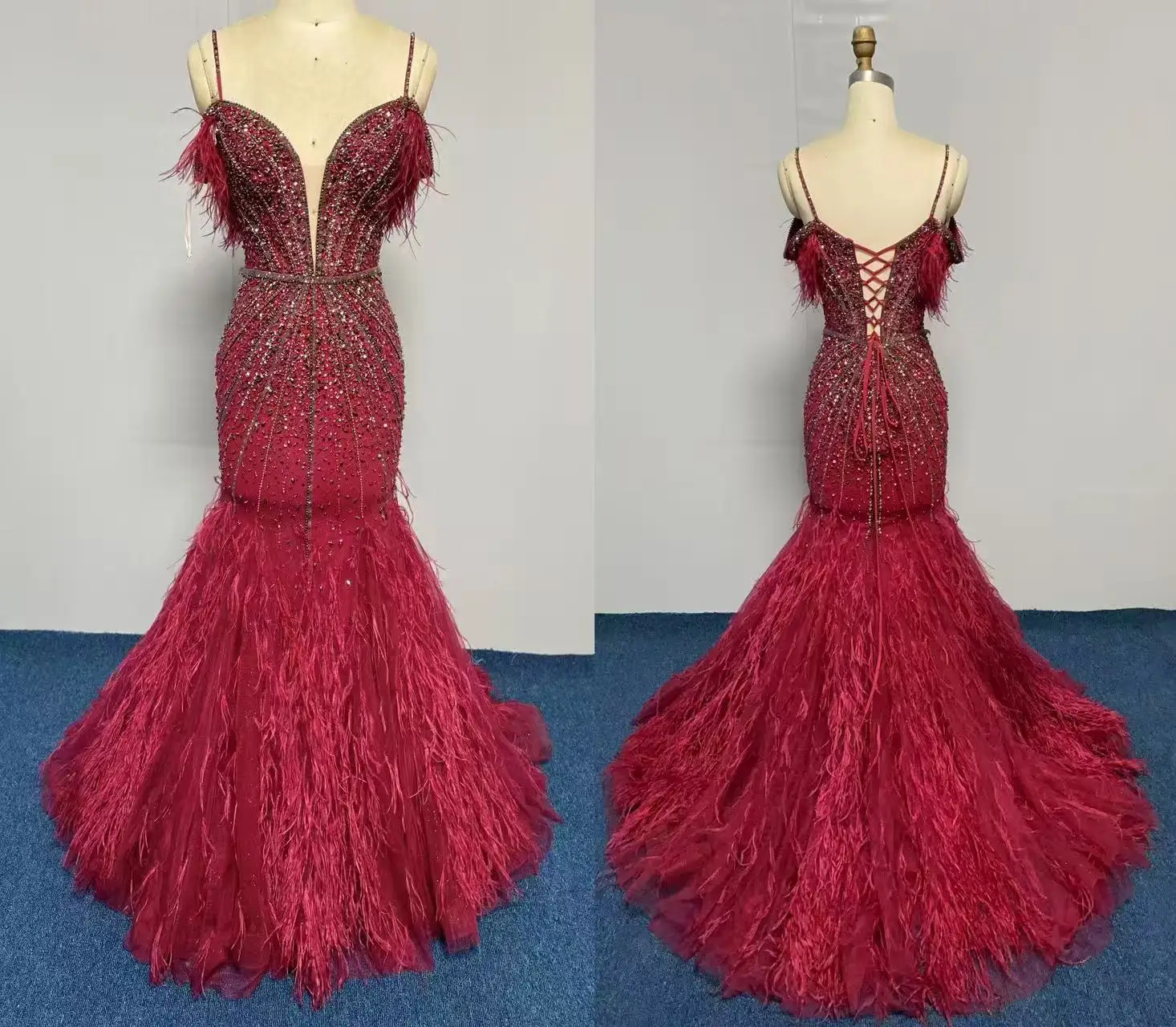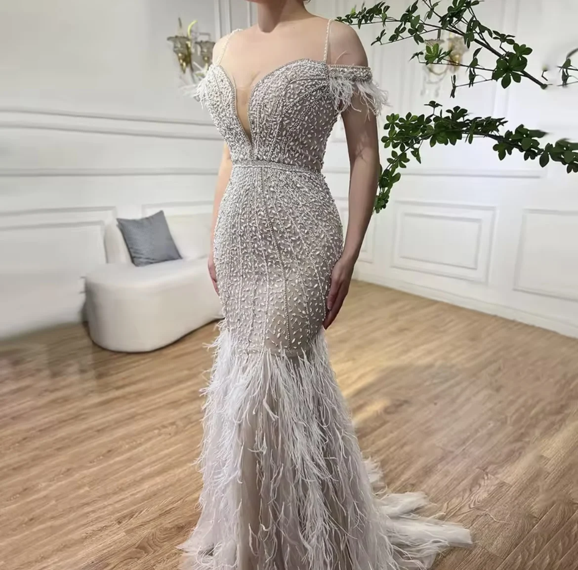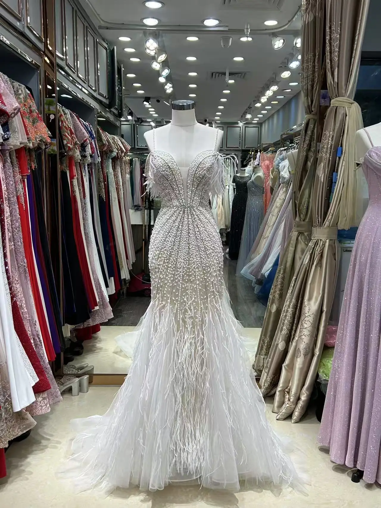 Luxury Feather White Nude Prom Evening Dresses Elegant Long Women's Wedding Party Dress