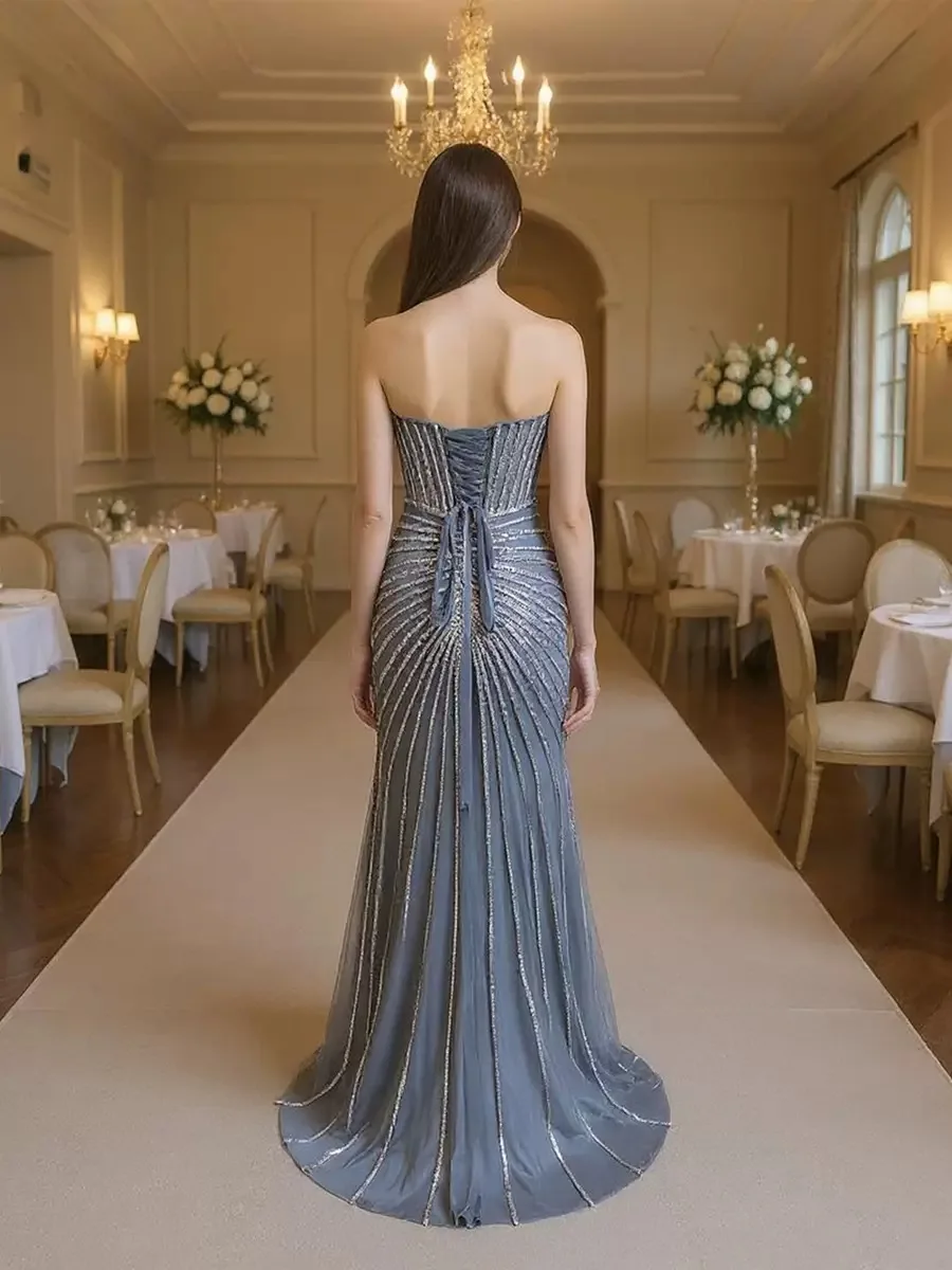 Smoky Blue Strapless Mermaid Hand Pleated Corset Crystal Embellished Sparkling Formal Prom Gala Dress