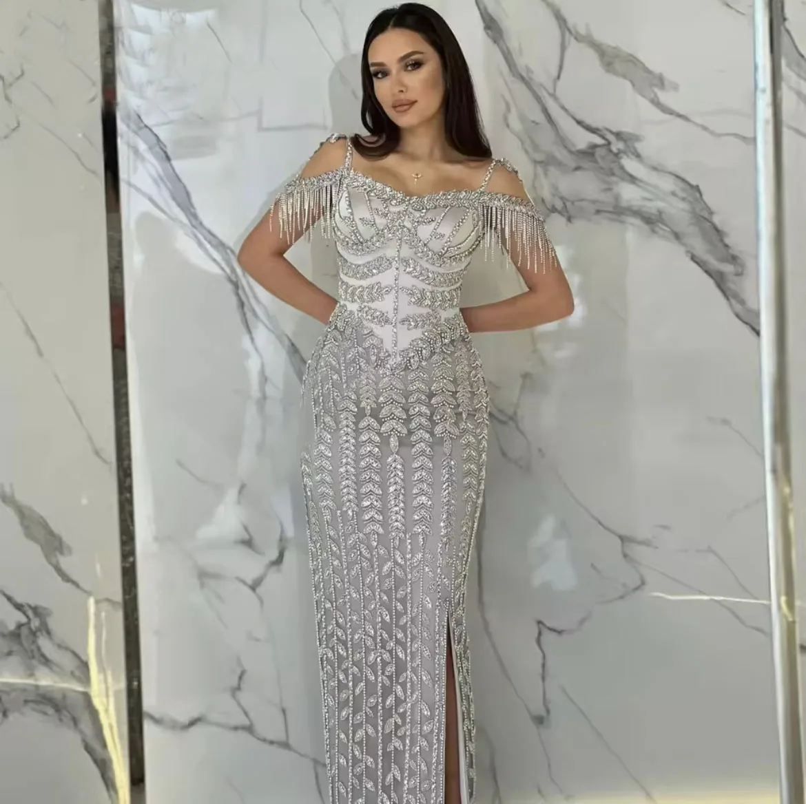 Saudi Arabic Luxury Tassel Straight Off Shoulder Evening Dress for Women Wedding Formal Party Gowns