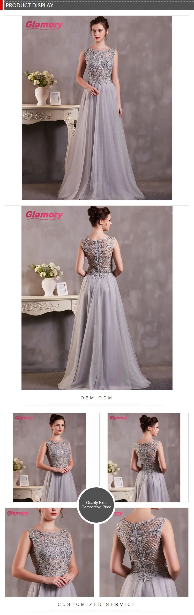 Gray Dresses Long Sexy See Through Lace Appliques Prom O-neck Floor-length Tulle Evening Dress